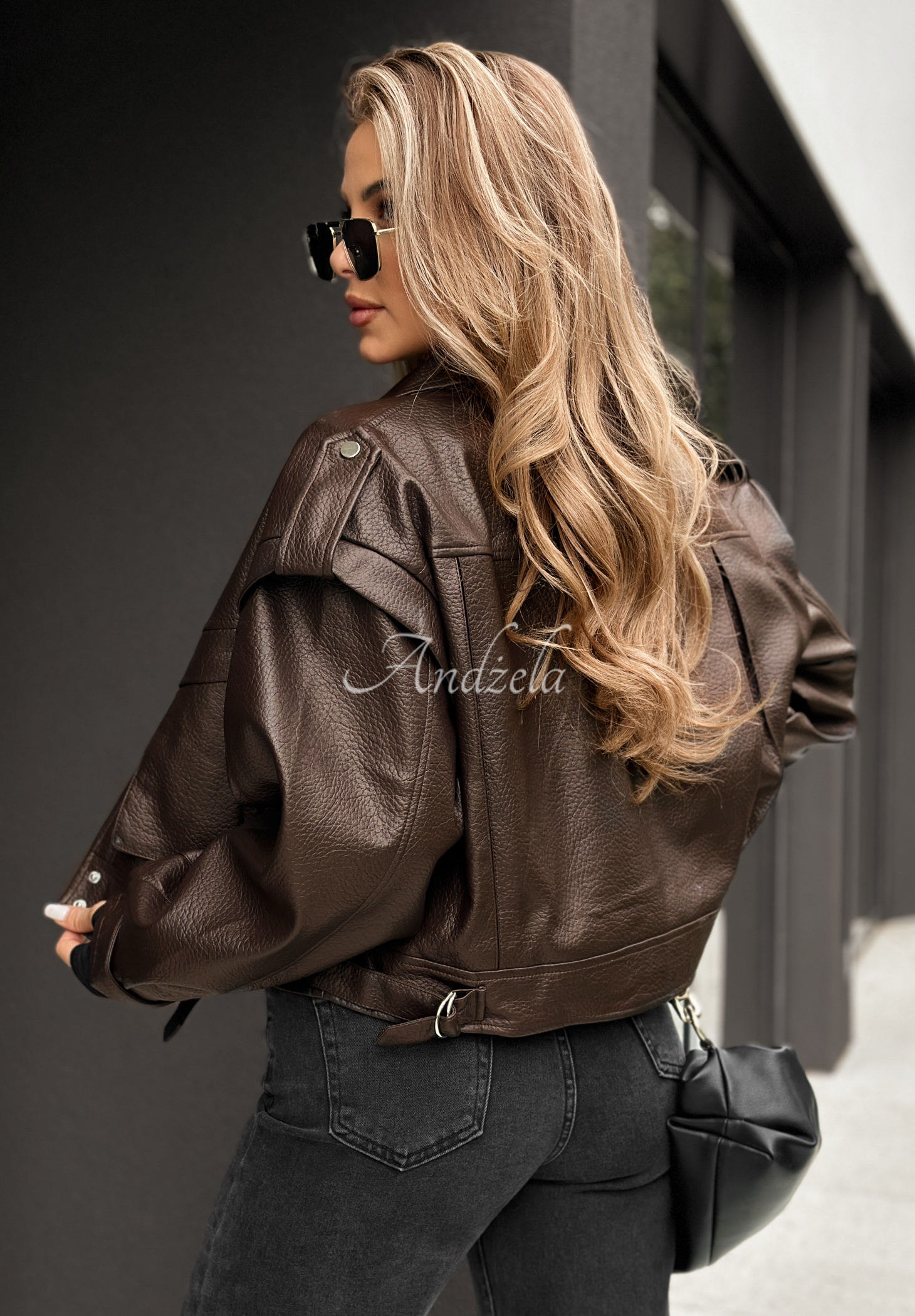 Classic oversized cut ramoneski, made of high-quality organic leather. It is a short cut design with a lining, collar and a row of buttons. There are functional pockets on the front. The whole is completed with silver details.