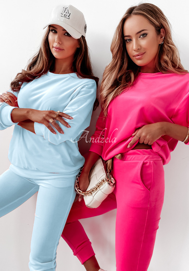 Velour set, made of smooth and velvety to the touch material. The model has welts at the legs and sleeves, as well as functional inset side pockets in the front of the pants. There is an elastic waistband with a decorative satin ribbon. The sweatshirt is distinguished by a gold-colored patch, which is located on one of the sleeves. This model will look best in a casual look, paired with sports shoes. The product is available in many color versions.