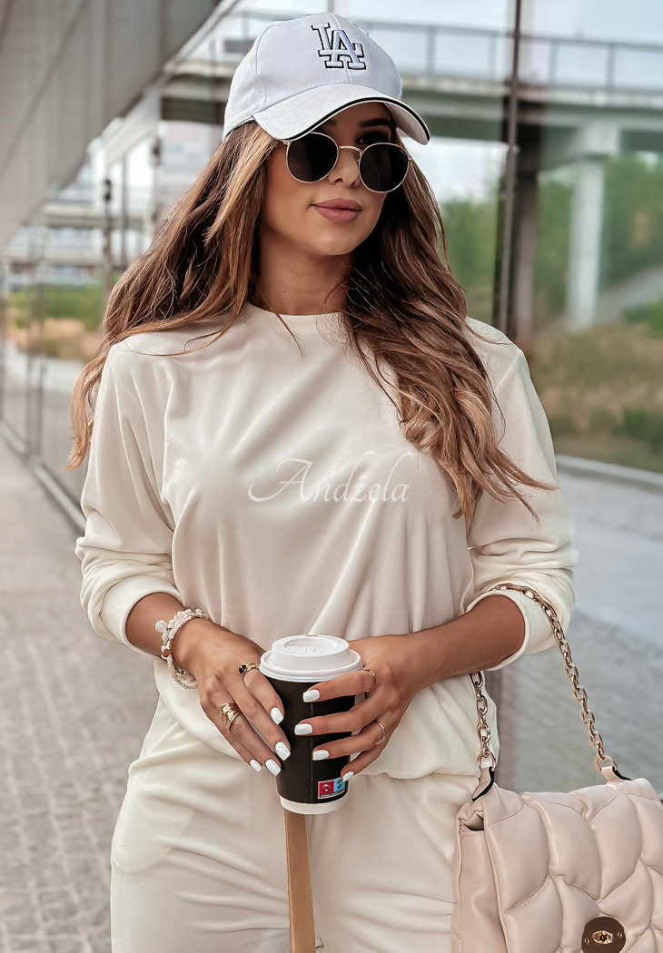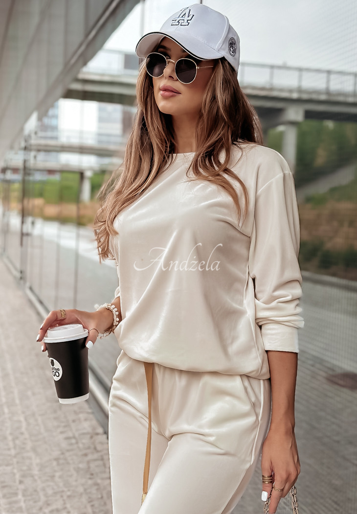 Velour set, made of smooth and velvety to the touch material. The model has welts at the legs and sleeves, as well as functional inset side pockets in the front of the pants. There is an elastic waistband with a decorative satin ribbon. The sweatshirt is distinguished by a gold-colored patch, which is located on one of the sleeves. This model will look best in a casual look, paired with sports shoes. The product is available in many color versions.