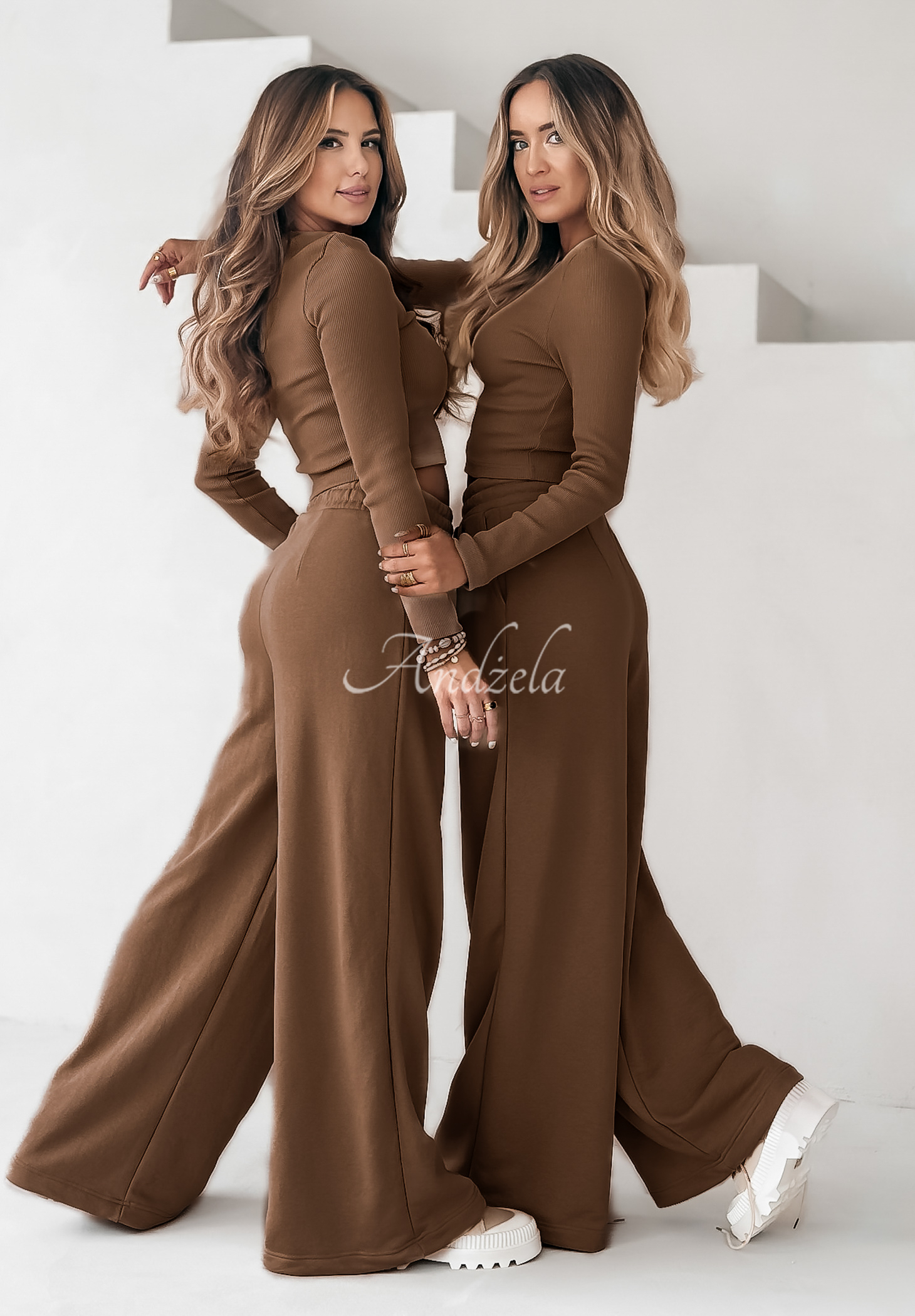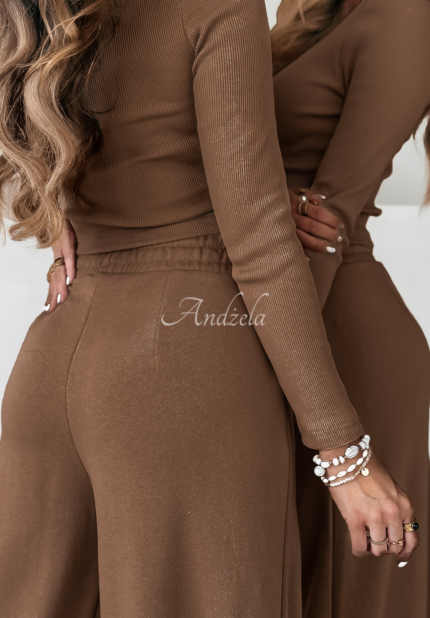 A unique set made of high-quality fabric is a perfect base for many everyday looks. A short, ribbed blouse with a rounded neckline and a patch at the bottom. Pants with elastic waistband and side pockets stand out with wide legs. Available in several color versions.