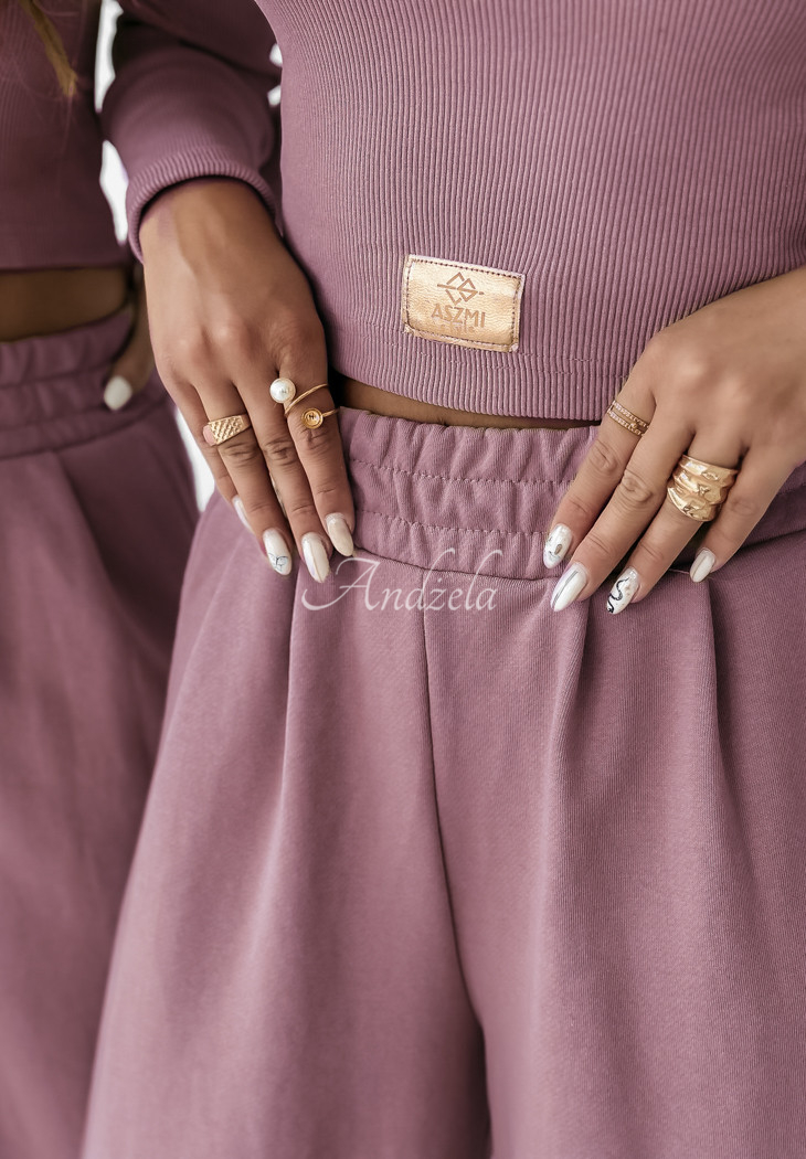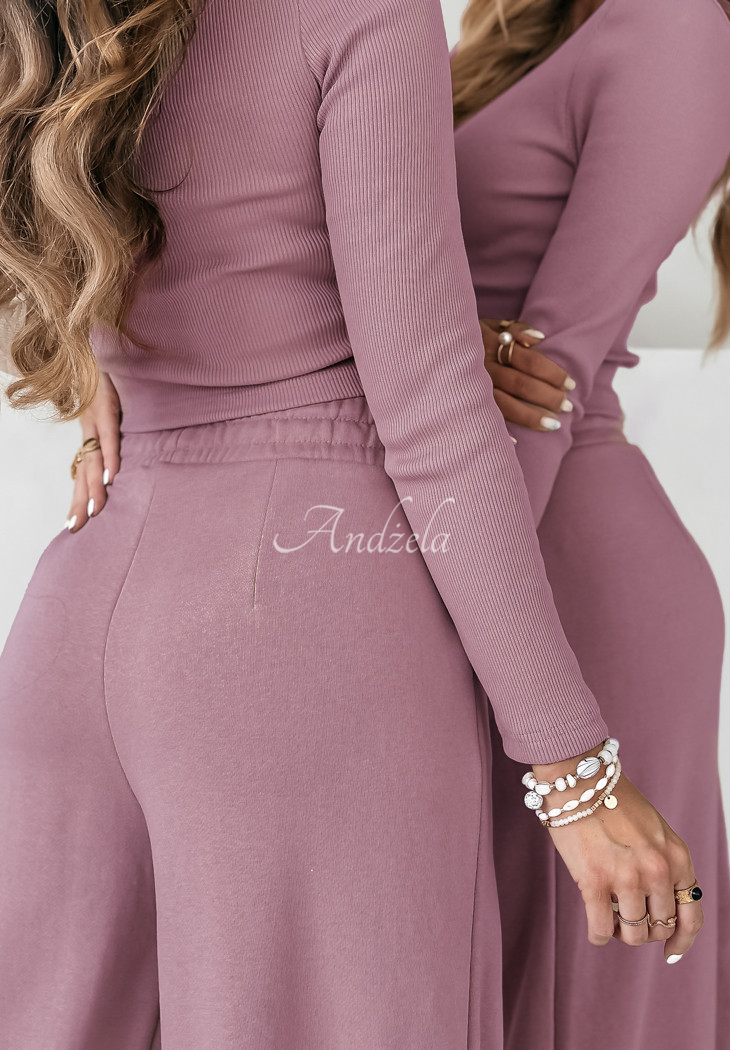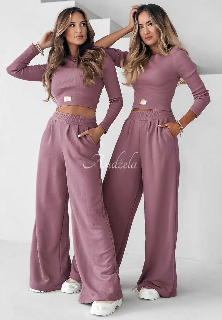 A unique set made of high-quality fabric is a perfect base for many everyday looks. A short, ribbed blouse with a rounded neckline and a patch at the bottom. Pants with elastic waistband and side pockets stand out with wide legs. Available in several color versions.