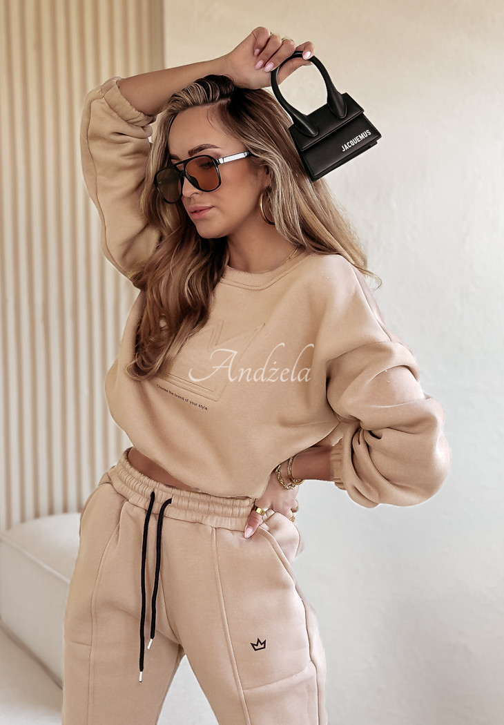 Cotton sweatshirt set is an option created for fashionable yet comfortable loos. The shorter cut sweatshirt is distinguished by an embossed pattern on the front with a minimalist print underneath. Its long sleeves and hem are finished with ribbed cuffs. The pants are a model with pockets on the front and an elastic waistband, thanks to which they fit perfectly to the figure. The whole is insulated, so it will be perfect for colder days.