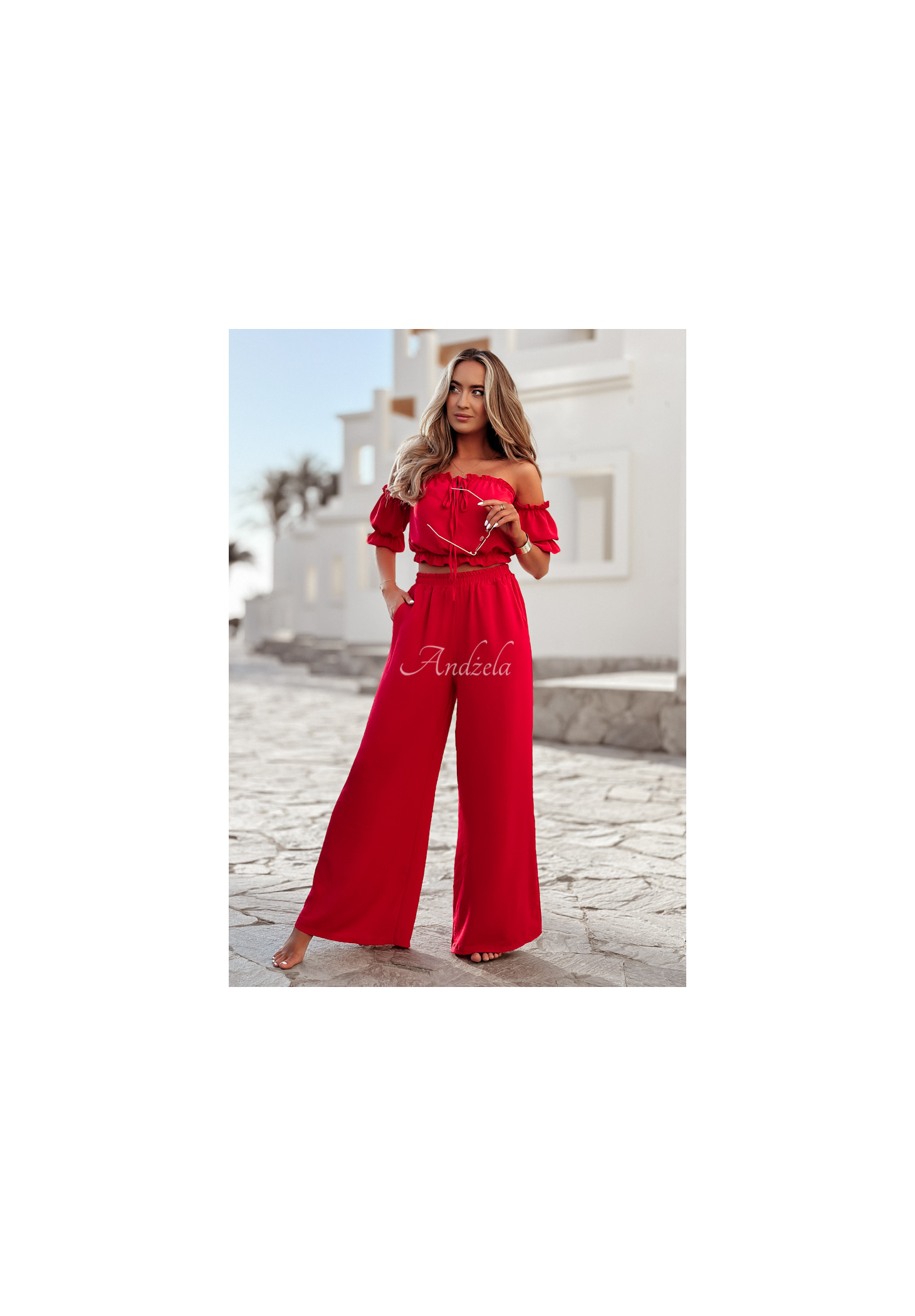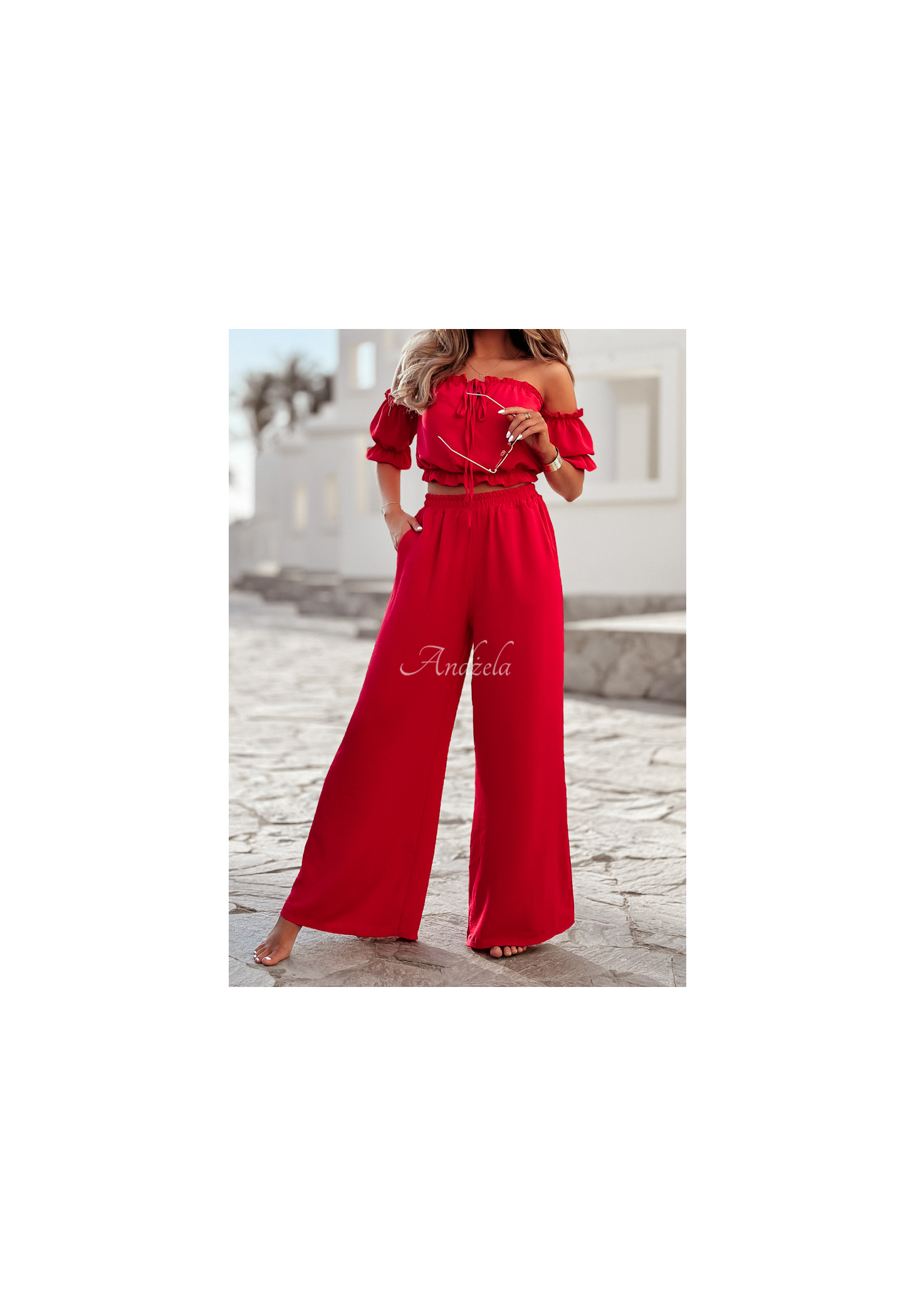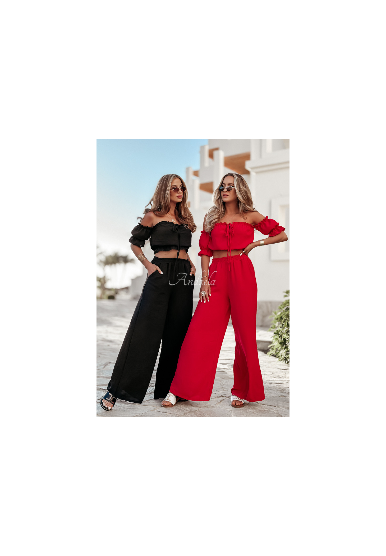 A set made of delicate, airy fabric is an excellent choice as a base for many looks. The blouse with elastic bands at the shoulders and at the bottom has short sleeves with ribbed cuffs and a tie at the neckline. The wide-leg pants have pockets on the side, and there is a sewn-in elastic waistband. Available in several color versions.