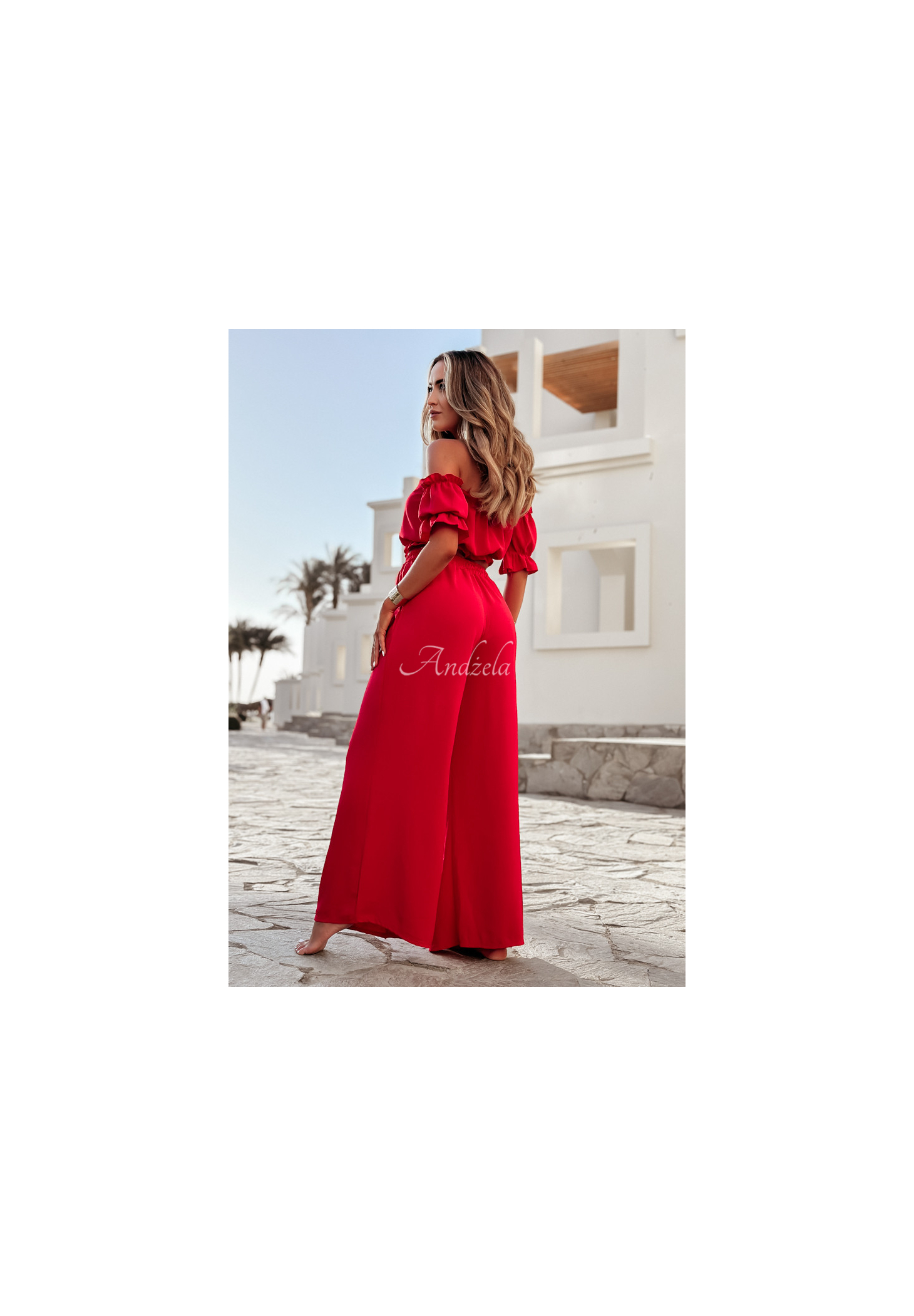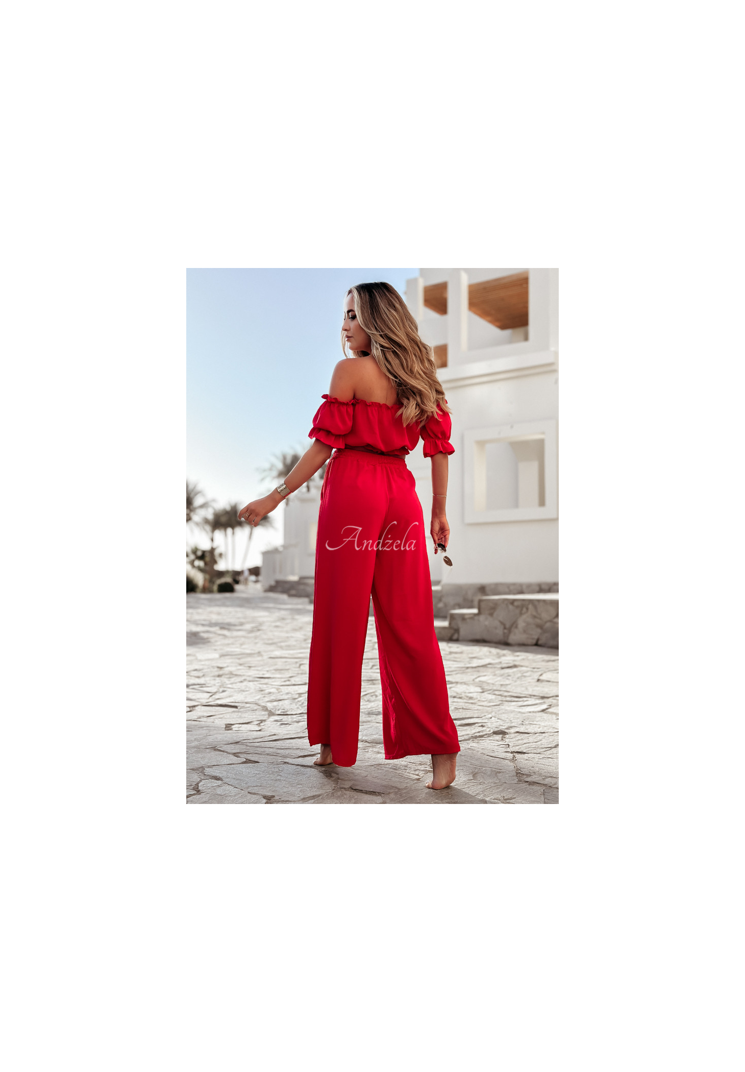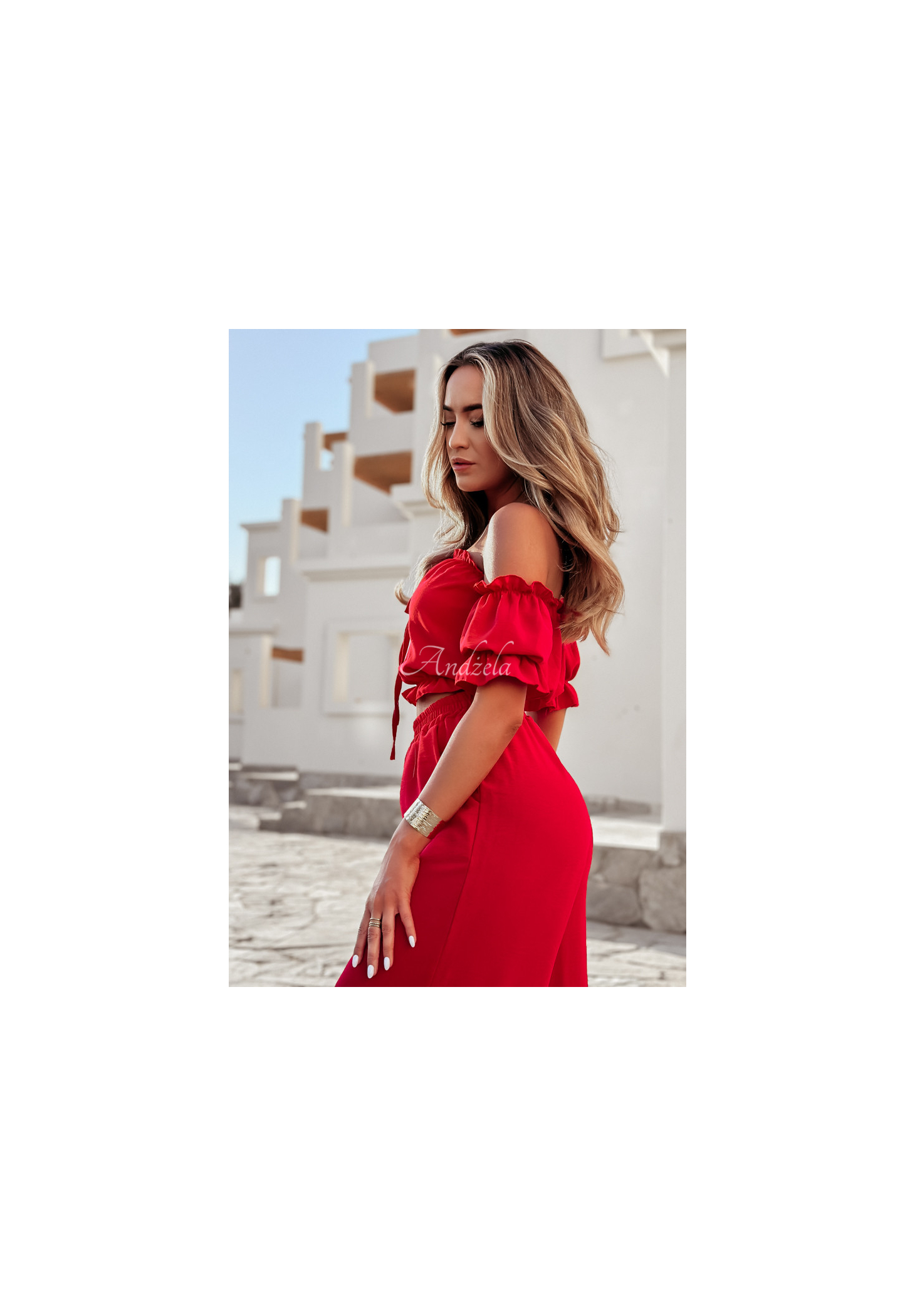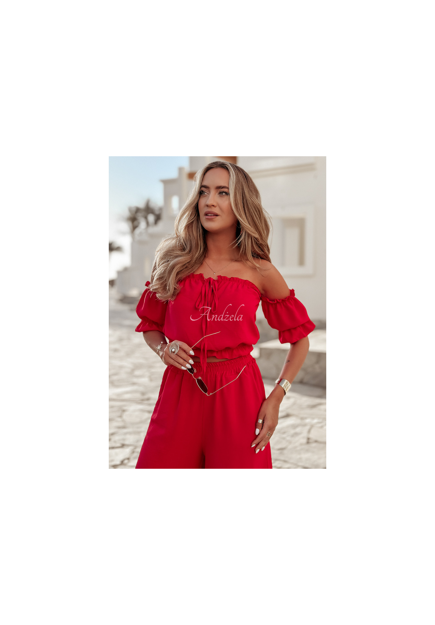 A set made of delicate, airy fabric is an excellent choice as a base for many looks. The blouse with elastic bands at the shoulders and at the bottom has short sleeves with ribbed cuffs and a tie at the neckline. The wide-leg pants have pockets on the side, and there is a sewn-in elastic waistband. Available in several color versions.