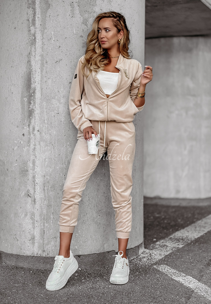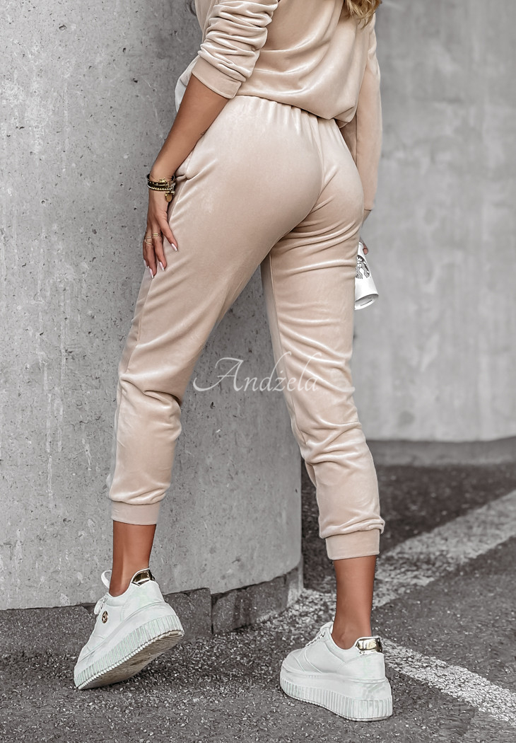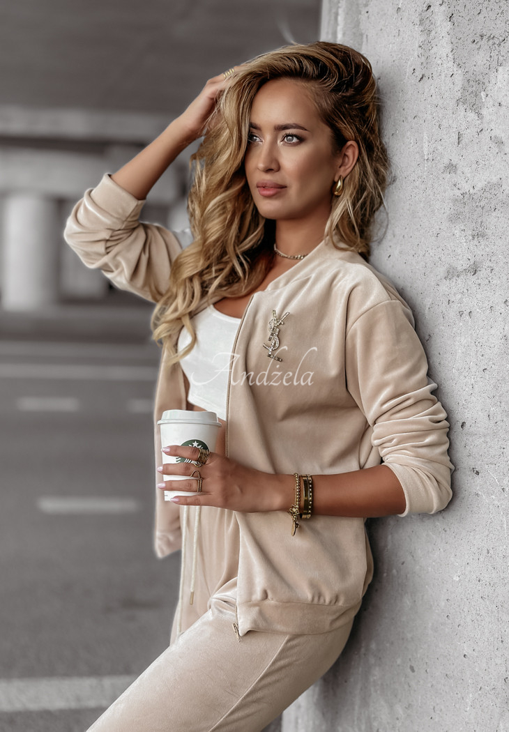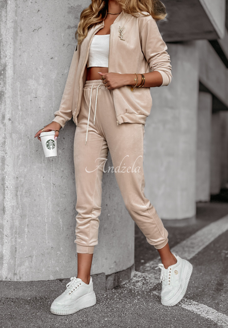 A velour set made of high-quality cotton material is a perfect proposition for women who opt for comfortable, yet fashionable solutions. The blouse with a classic cut is fastened with a zipper. The pants are a model with drawstrings at the legs and functional pockets on the front. They have an elastic adjustable waistband, thanks to which they perfectly fit the figure. The whole set will present itself really great in everyday loos.