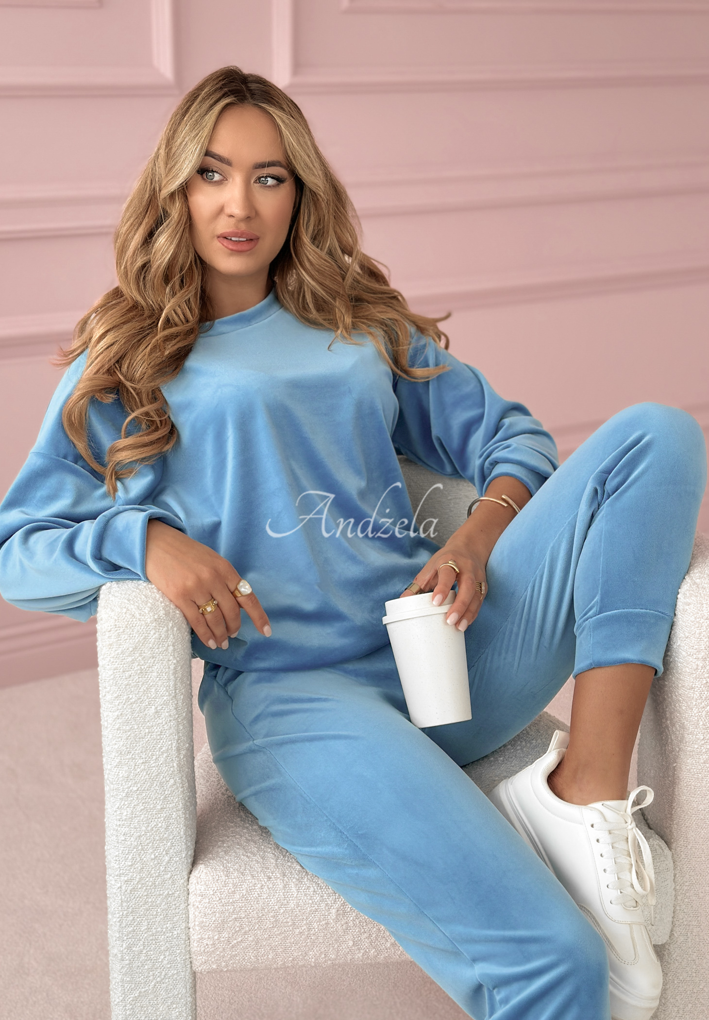 The velour sweatshirt set is a proposition created for everyday looks in a comfortable way. It was made of cotton fabric that is pleasant to the touch. The blouse with a rounded neckline has long sleeves finished with welts. The pants, on the other hand, are a model with an elastic waistband and functional pockets on the front. The whole piece fits perfectly on the silhouette and looks really fashionable, while being comfortable.