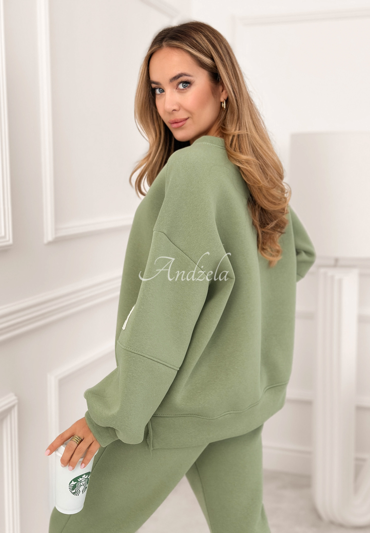 A warm tracksuit set made of cotton fabric. The sweatshirt with a rounded neckline features a patch on the sleeve. The high-waisted pants have an elastic waistband and ribbed cuffs.