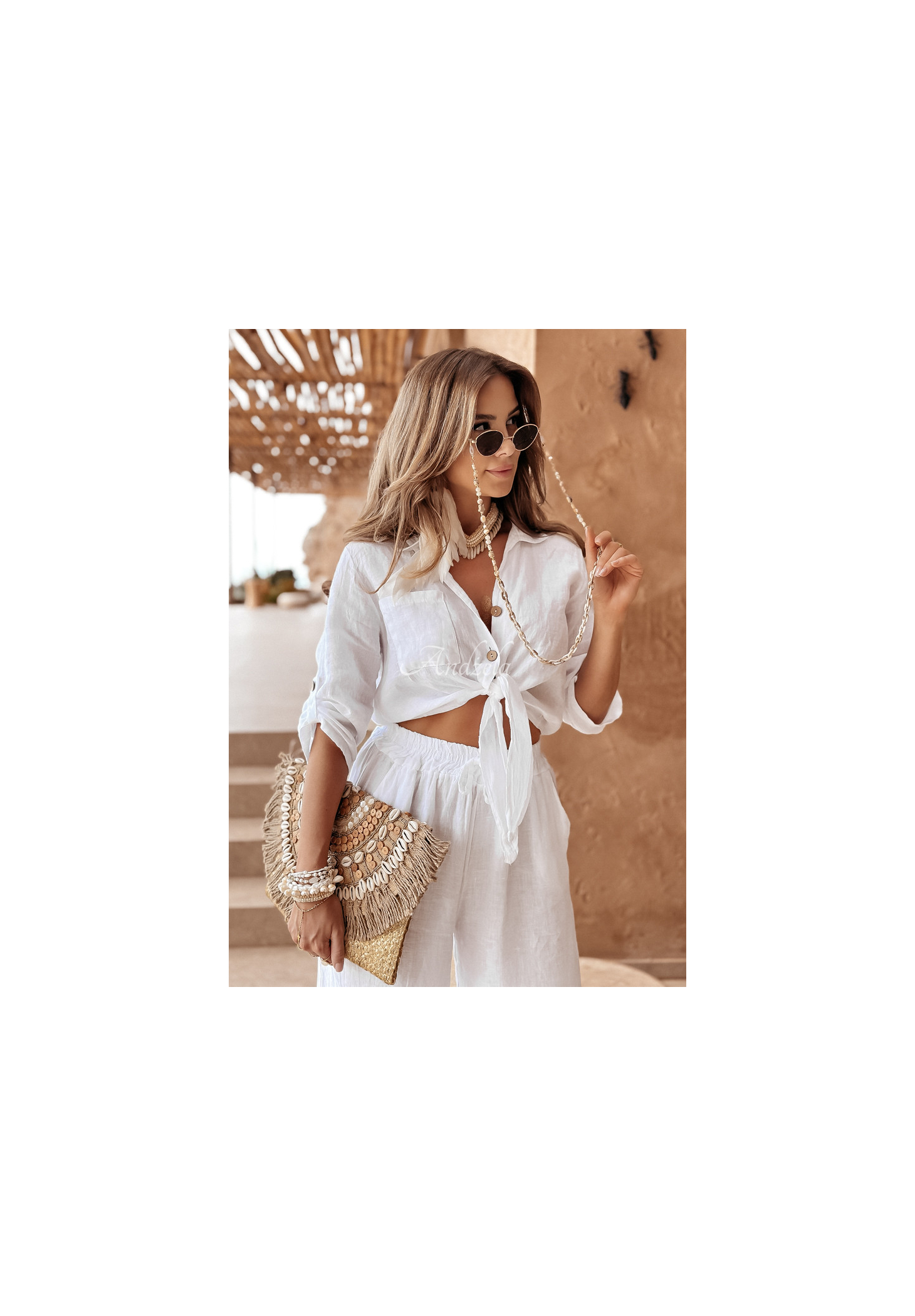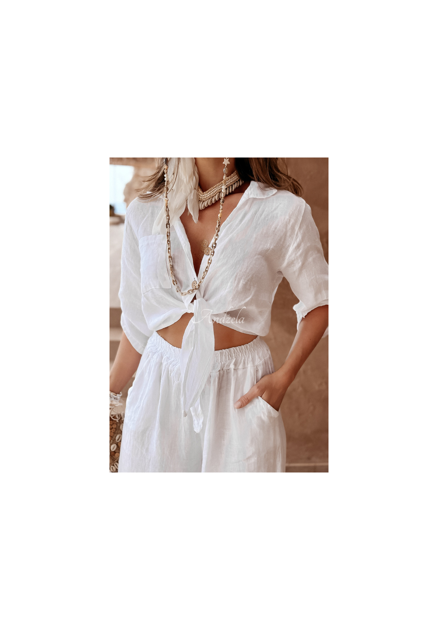Short shirt made of high-quality linen fabric. It is buttoned, has sleeves that are gently adjustable in length and ties at the front. At the height of the bust there is a pocket. This proposition will be perfect for any summer closet and will fit perfectly into everyday looks.