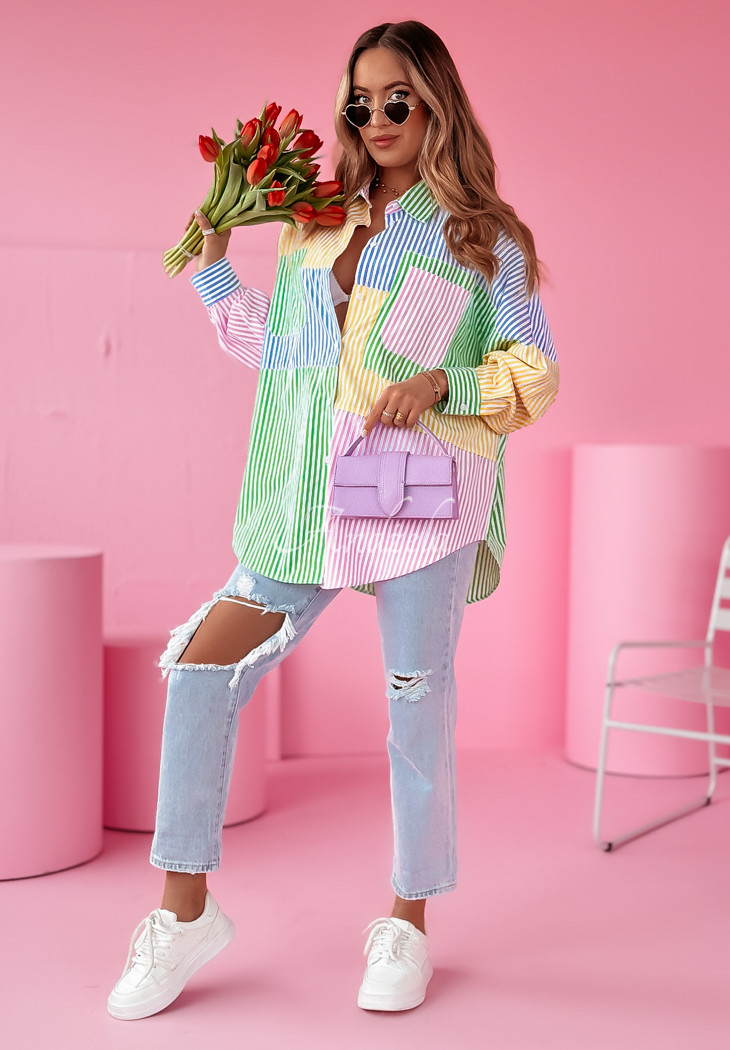 The striped shirt is a great base for everyday looks. The gently asymmetrical model with an oversized cut, is buttoned. The sleeves are finished with cuffs. This proposal will phenomenally compose when combined with matching leggings or jeans.