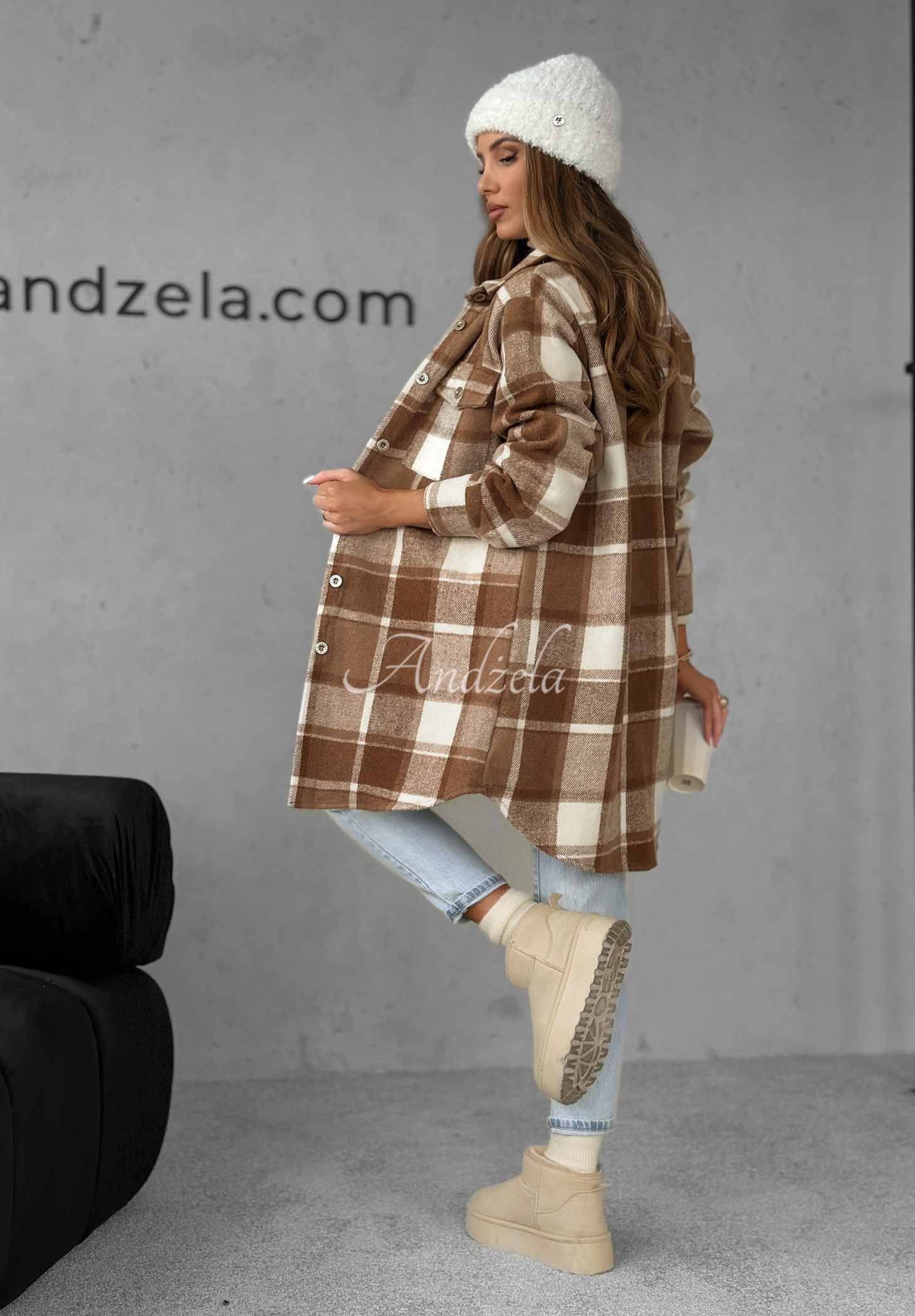 A plaid shirt made of soft, thicker material. It is a slightly longer cut model with a collar and button closure. There are functional pockets on the front, and the long sleeves are finished with cuffs.