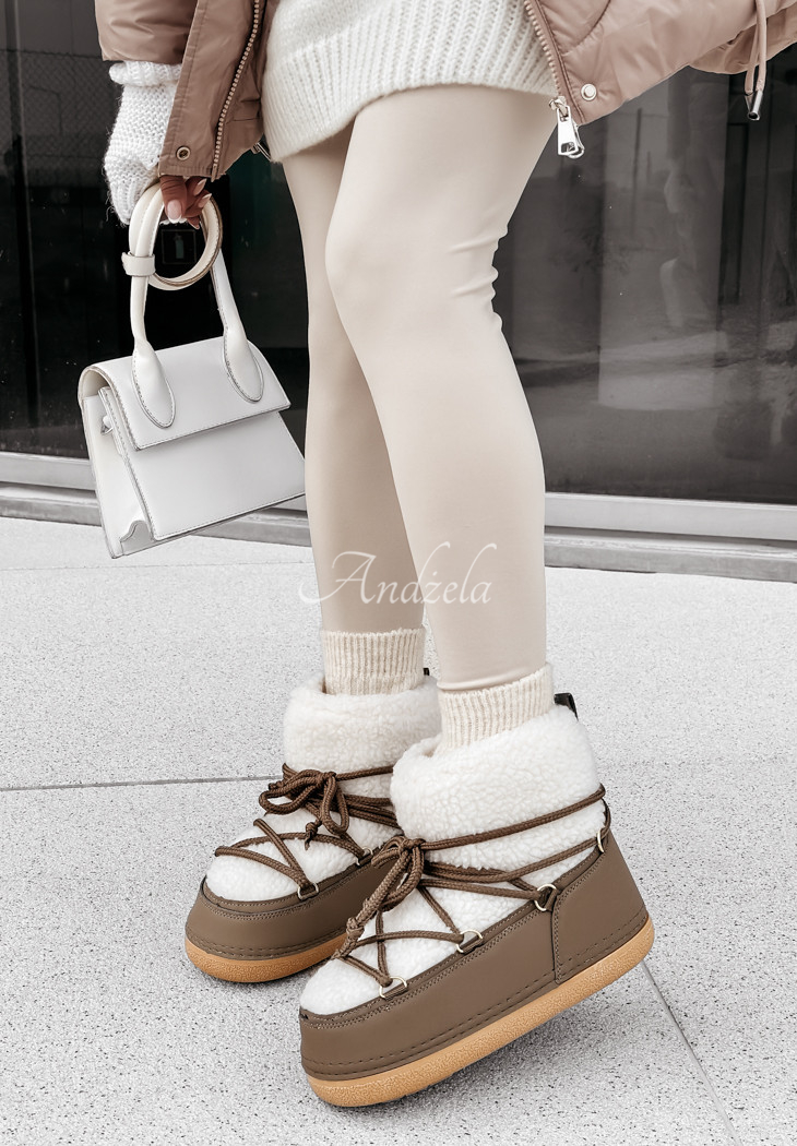 Warmed snow boots made of imitation leather with sheepskin are a great choice for colder days. The model with lacing is set on a higher sole with a rounded nose. Shoes are available in several color versions.