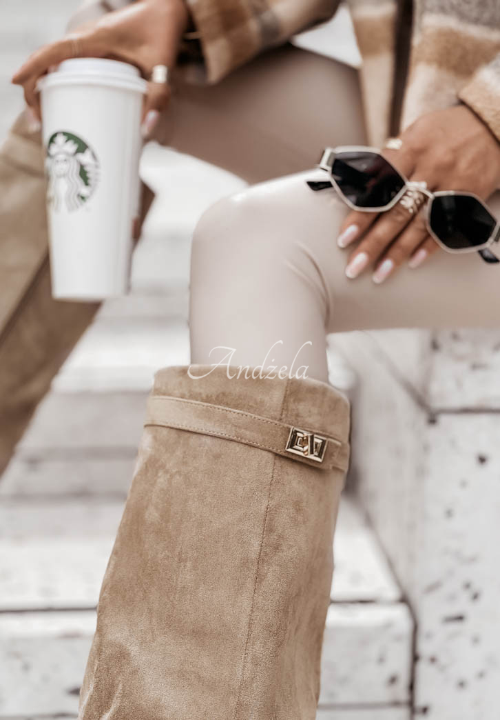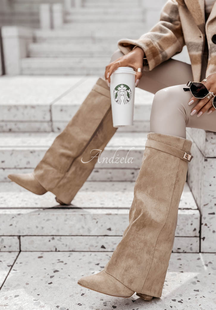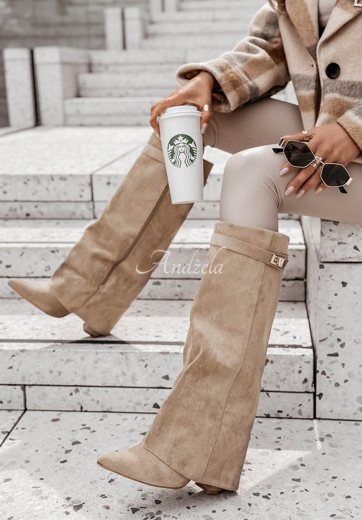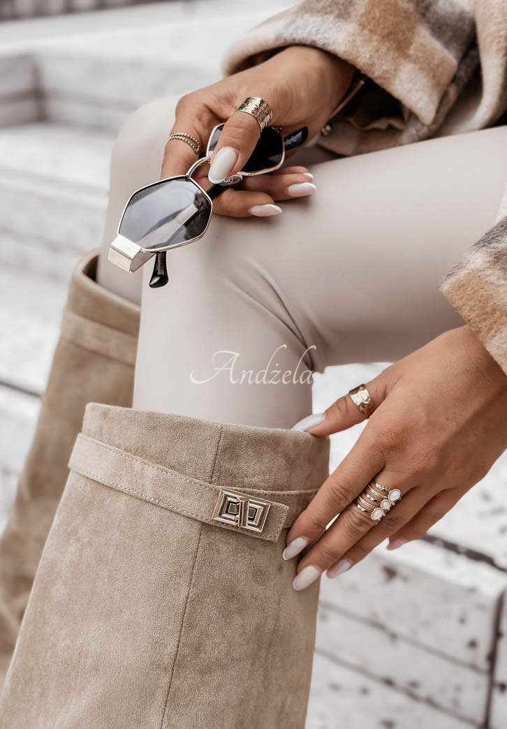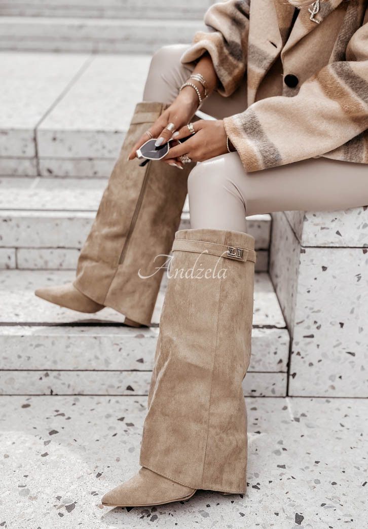 Long, suede boots set on a high post are a perfect choice to complement many looks. The model, zippered on the inside, is distinguished by a wide, turned-up upper, which is located on the outside of the shoe. An additional distinguishing element of these boots is a strap with a gold element on the side.