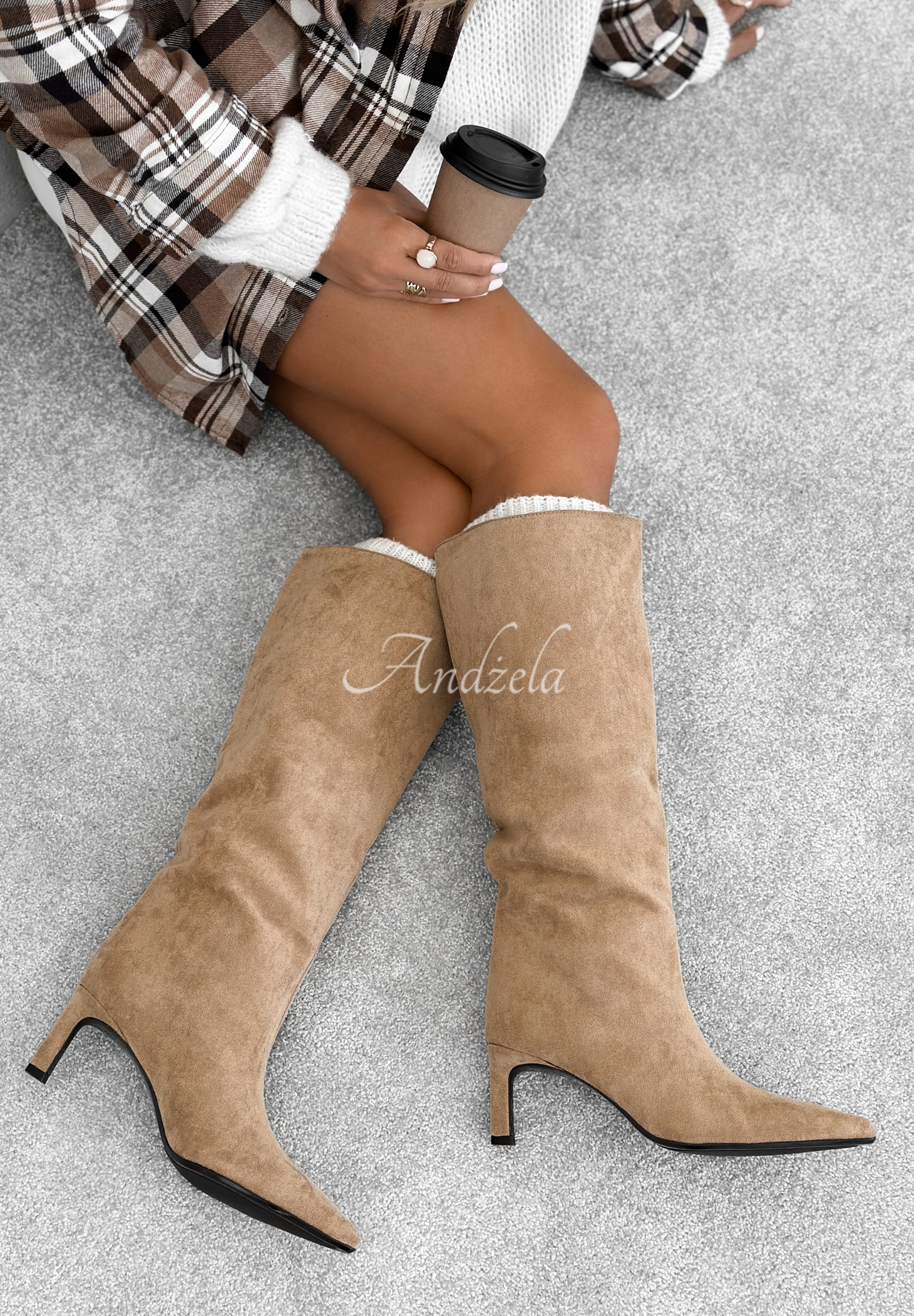 Knee-high boots, made of soft suede material. This model is set on a sole with a pointed toe and a narrow stiletto heel. It is gently insulated and does not have a fastening.