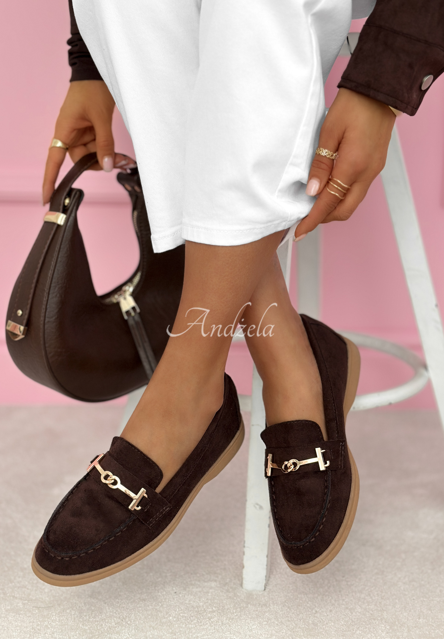 Suede moccasins with a flat rubber sole. This model features a rounded toe and a distinctive gold detail at the front. * imitation suede * rounded toe * gold detail* rubber flat sole