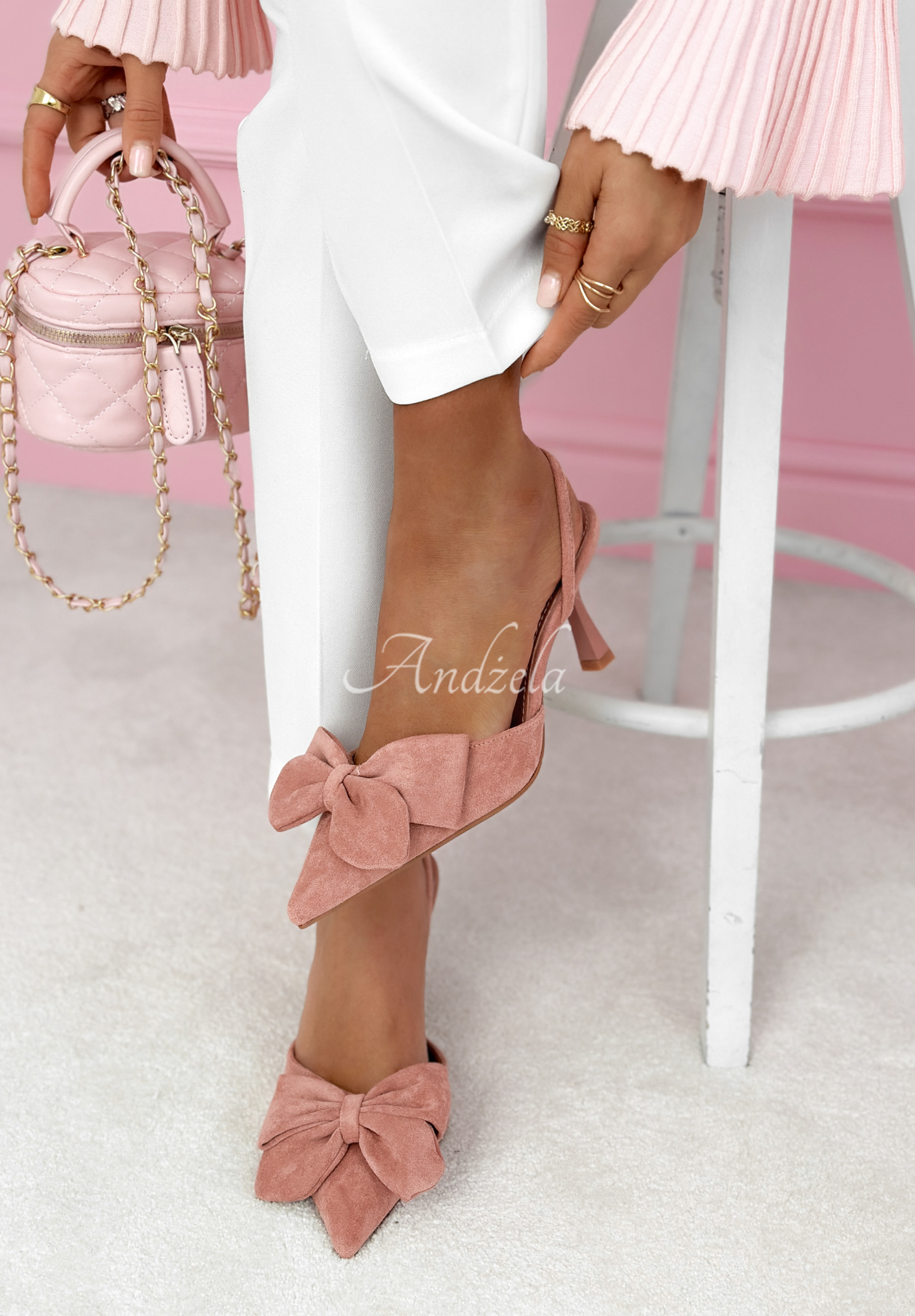 Open-heel sandals with a narrow heel. This model has a pointed toe and is distinguished by a decorative bow at the front.