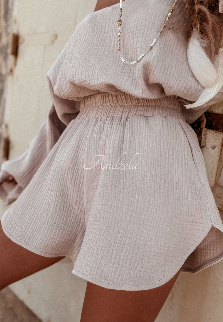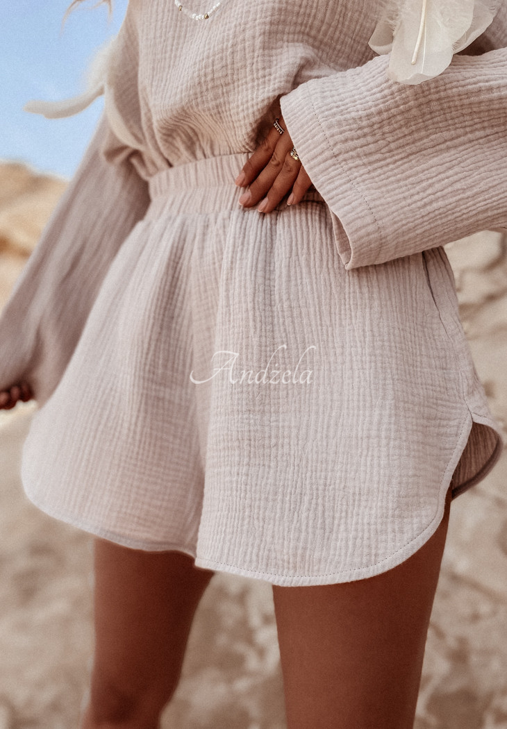 Short shorts, made of muslin, lightweight material, ideal for summer styling on hot days. They have an elastic waistband, thanks to which they fit perfectly to the figure, ensuring comfort. There are pockets on the front. This is an extremely comfortable model, it is versatile, so it will go with all kinds of blouses and accessories, creating many looks. High quality product, available in several color variants. Design by ANDŻELA!