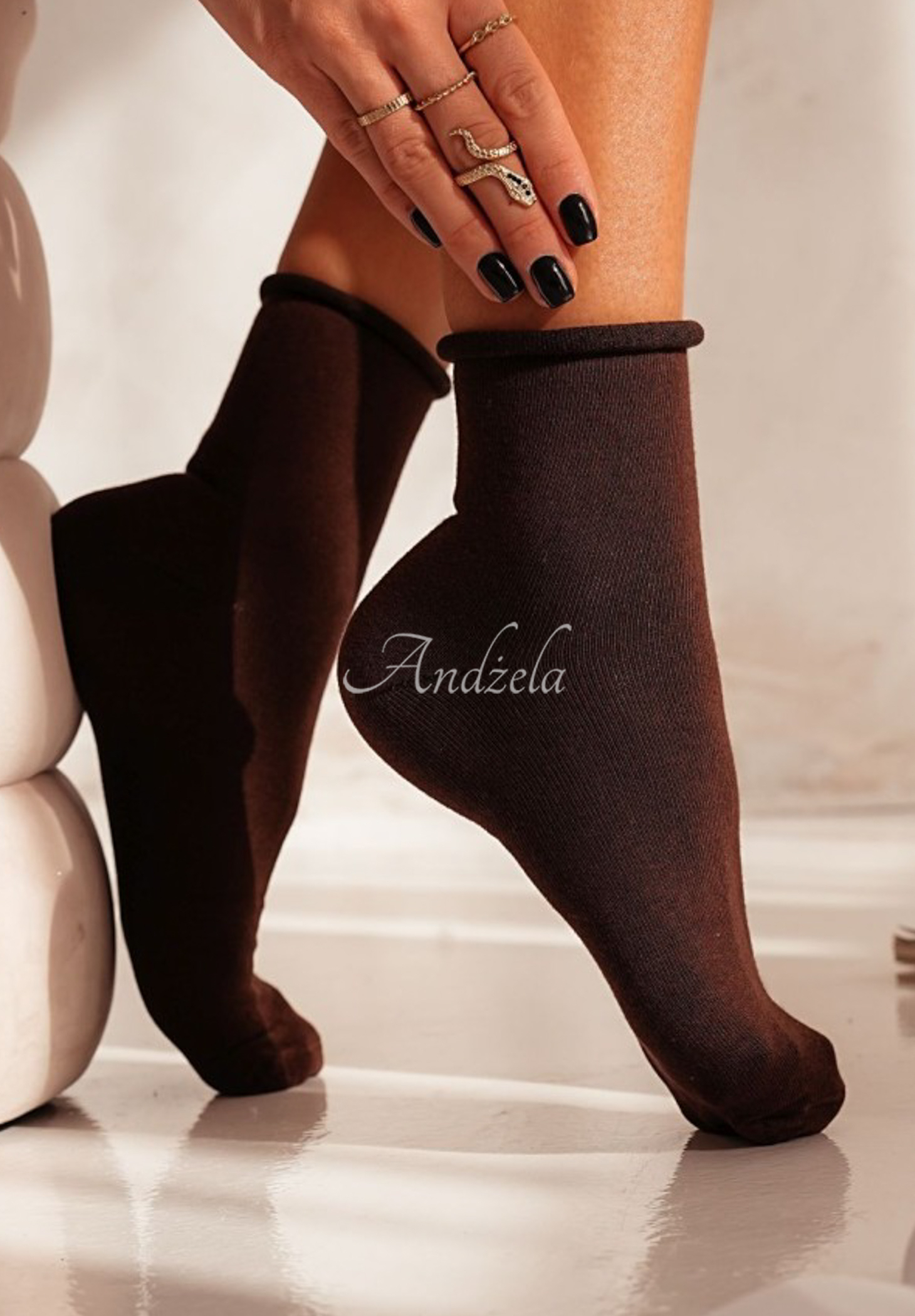 Long cotton socks will perfectly complement styling in comfort. They are made of elastic material, so they fit perfectly to the foot without putting pressure on it. They are distinguished by raw-finished edges that wrap around, which adds to the overall charm.