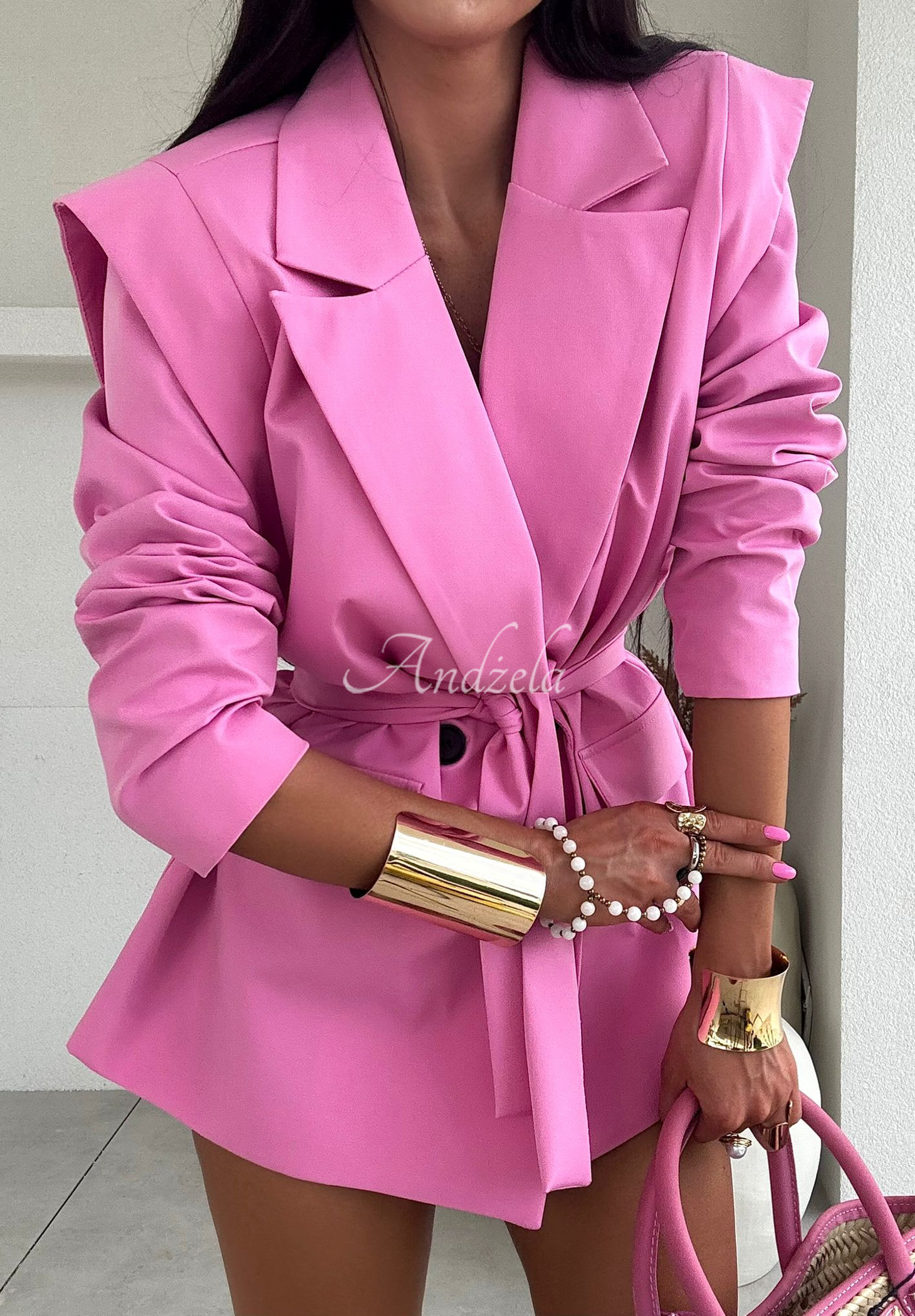Oversized blazer made of smooth fabric is a great choice to complement many looks. The button-down model features front flap pockets. Additional elements that make this model stand out are the shoulder pads, and the stand-off fabric. The jacket is available in two color versions.