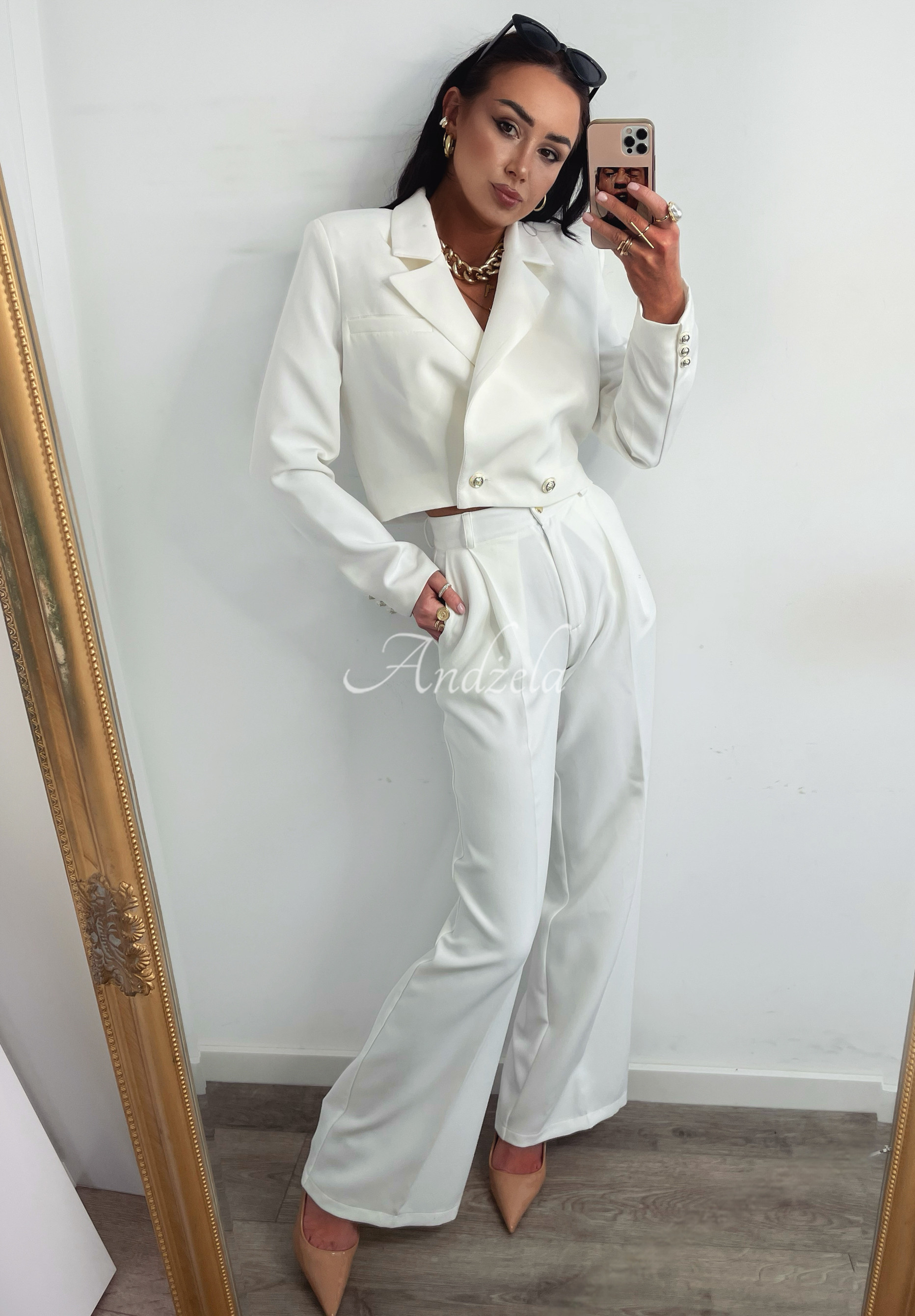 Elegant jacket is a proposition that will work in any closet. Short cut model with collar and fastening with two gold buttons. It has a lining, at the bust there is a small imitation pocket.