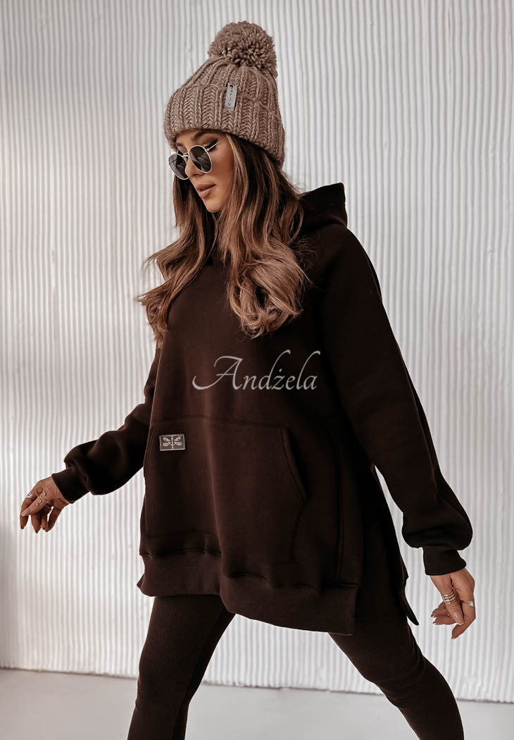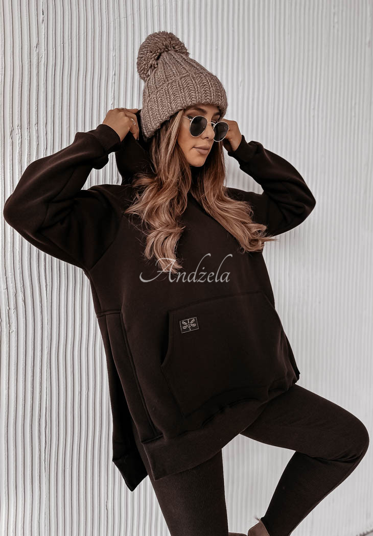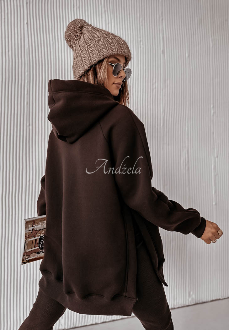 A warmed sweatshirt, distinguished by slits on the sides, will be perfect for cold days. Oversized model, has a hood, as well as a kangaroo pocket. The sleeves and hem are finished with welts. This proposal will be best presented in a comfortable way, paired with leggings. The product is available in two color variants.