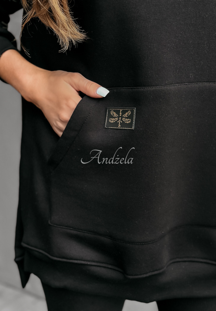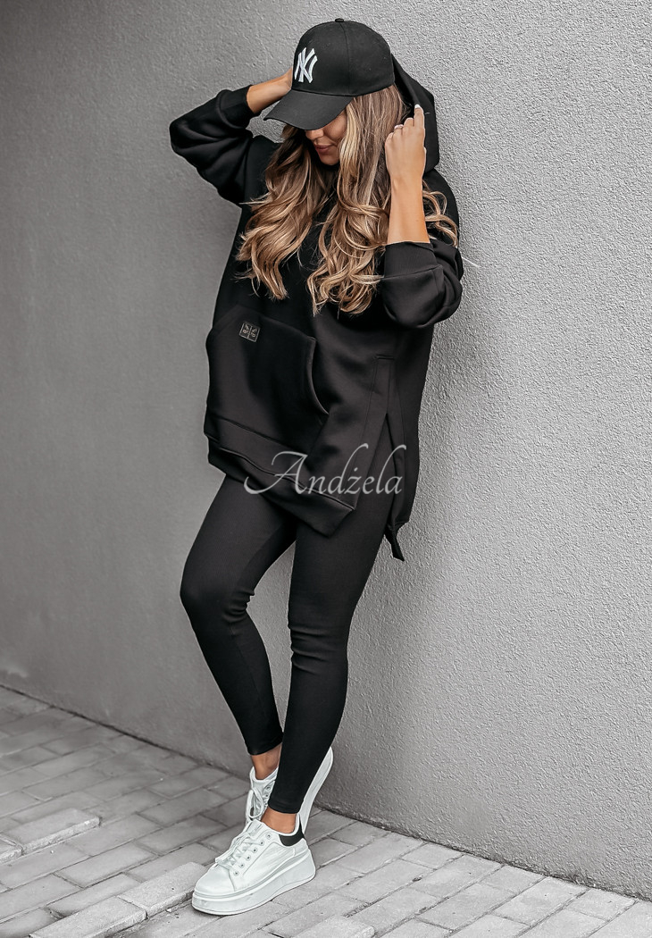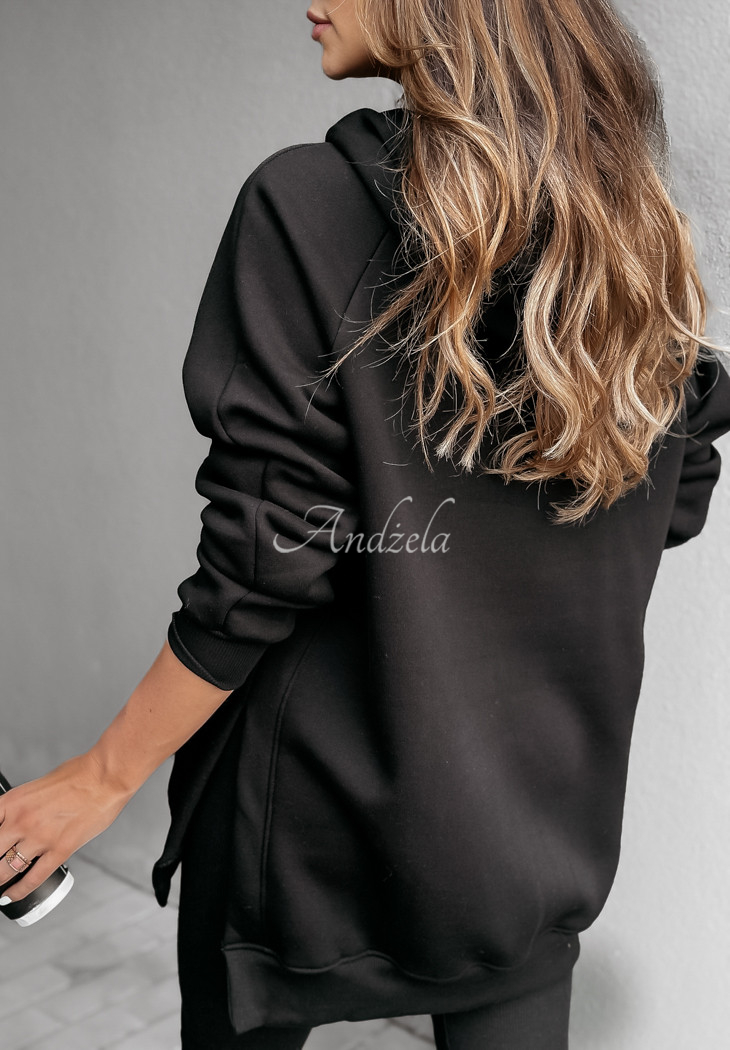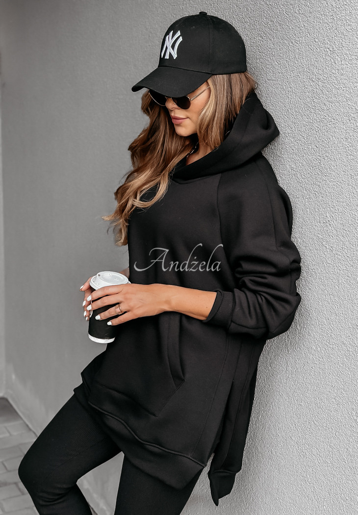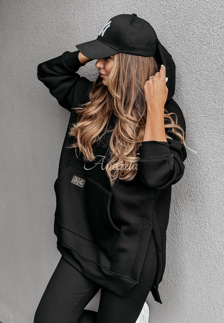 A warmed sweatshirt, distinguished by slits on the sides, will be perfect for cold days. Oversized model, has a hood, as well as a kangaroo pocket. The sleeves and hem are finished with welts. This proposal will be best presented in a comfortable way, paired with leggings. The product is available in many color variants.