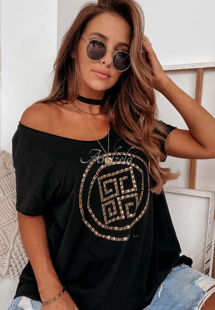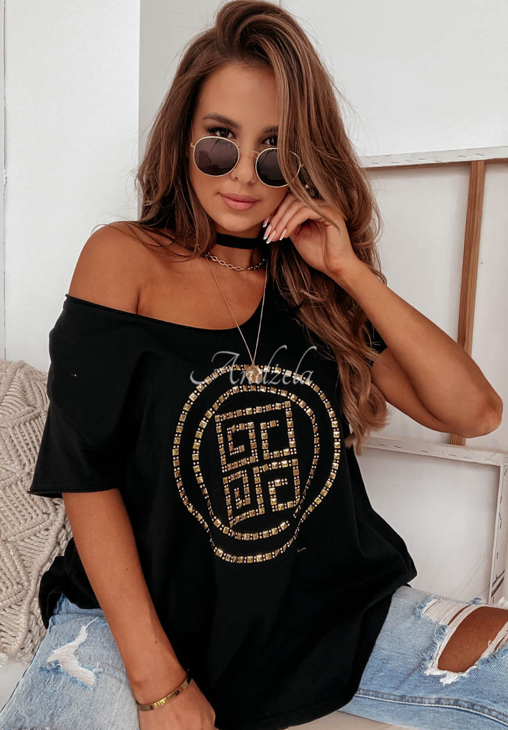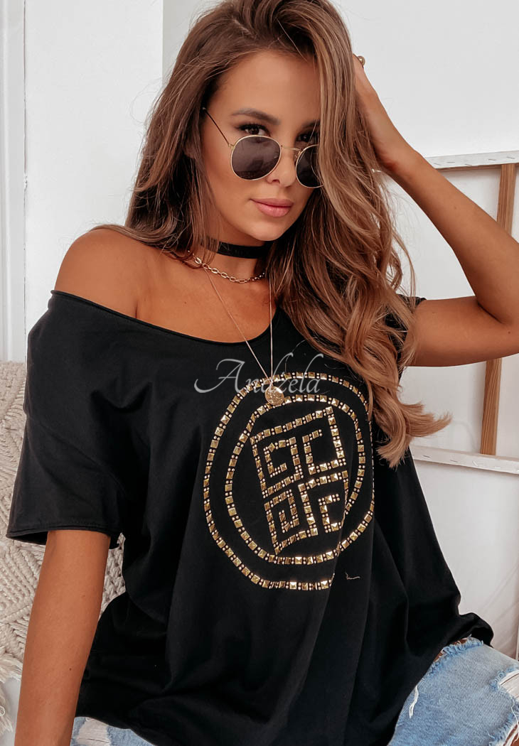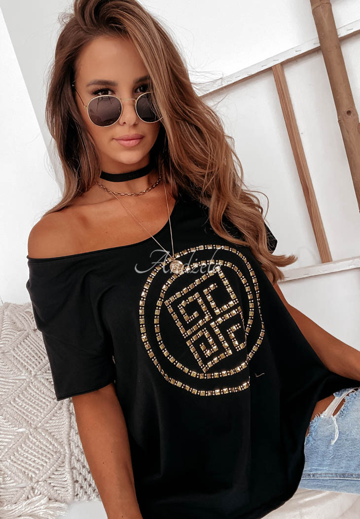 A classic oversized T-shirt made of high-quality material is the basis of any everyday styling. The model with a deep heart-shaped neckline is distinguished by an original applique on the front, which will give the whole thing a modern, as well as fashionable look. Compose it with shorts or a short skirt. Available in two color versions.