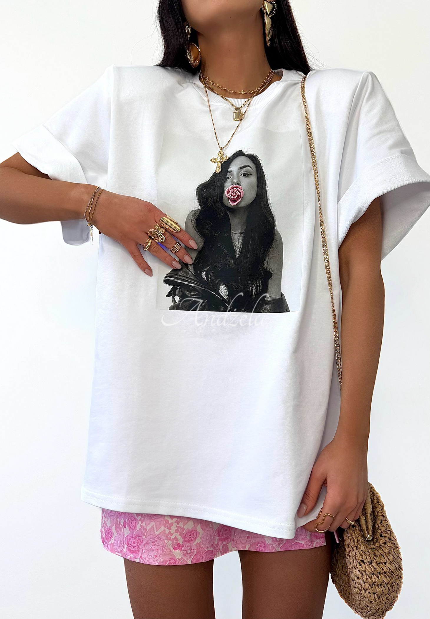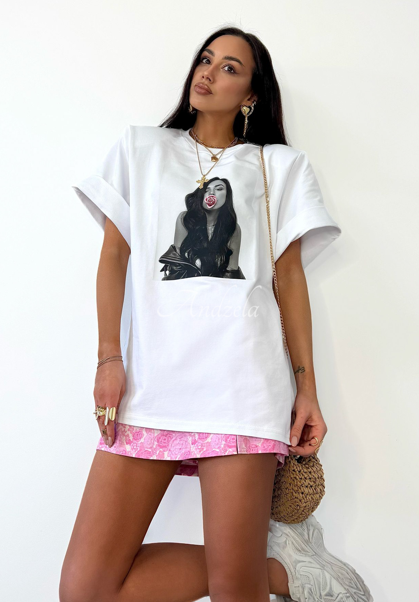 T-shirt made of high-quality cotton fabric. It is distinguished by a print on the front. It is a model with a rounded neckline and short sleeves. There are shaping pads on the shoulders.