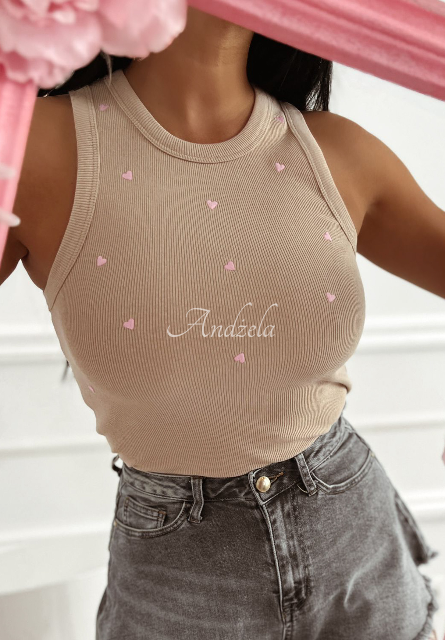 A classic top distinguished by minimalist heart-shaped embroidery. It is a model with a rounded neckline, made of ribbed cotton fabric.