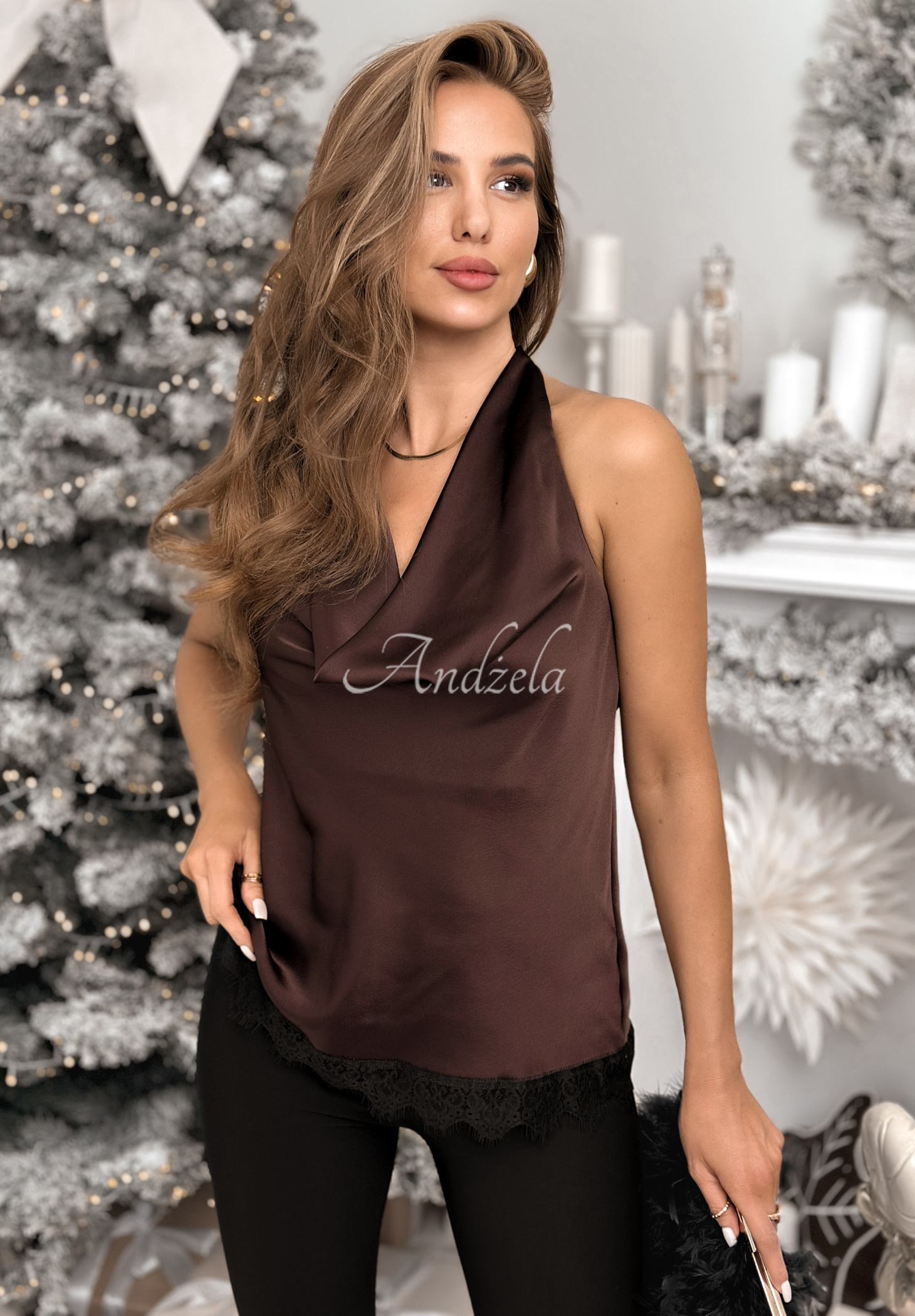 Satin top with halter neckline, distinguished by its exposed shoulders and back. It is a model with the addition of subtle lace and has an elastic band that is located at the back.
