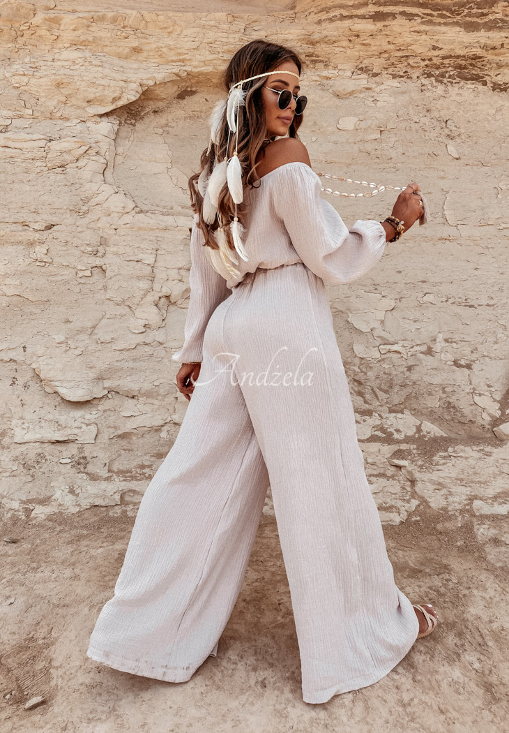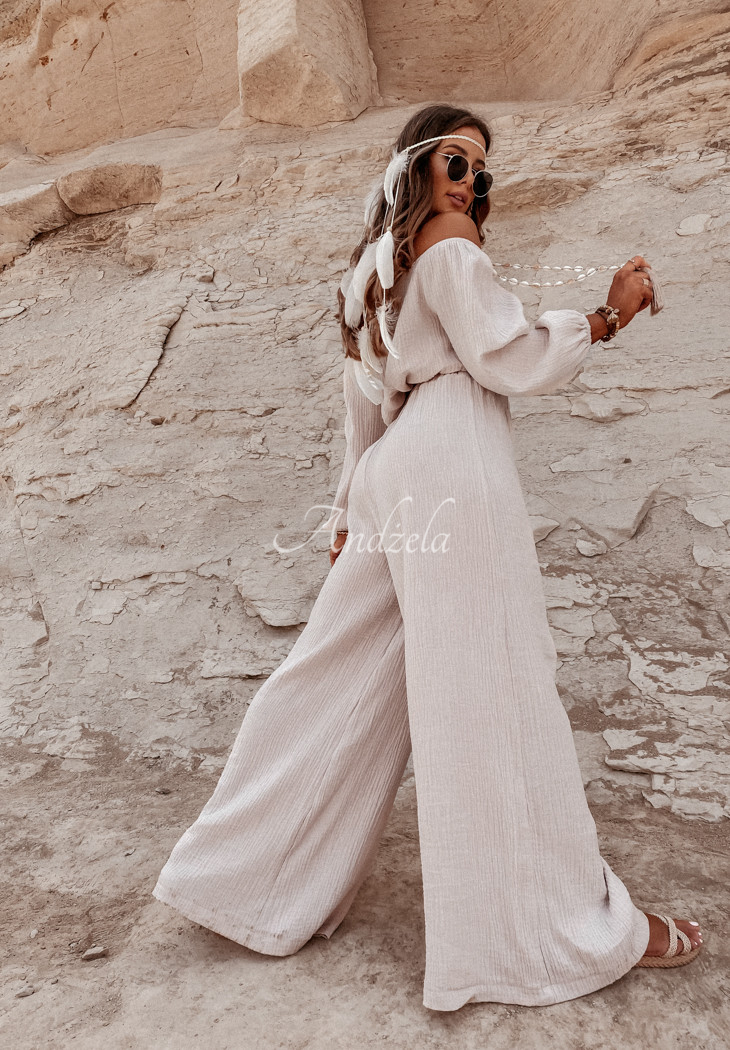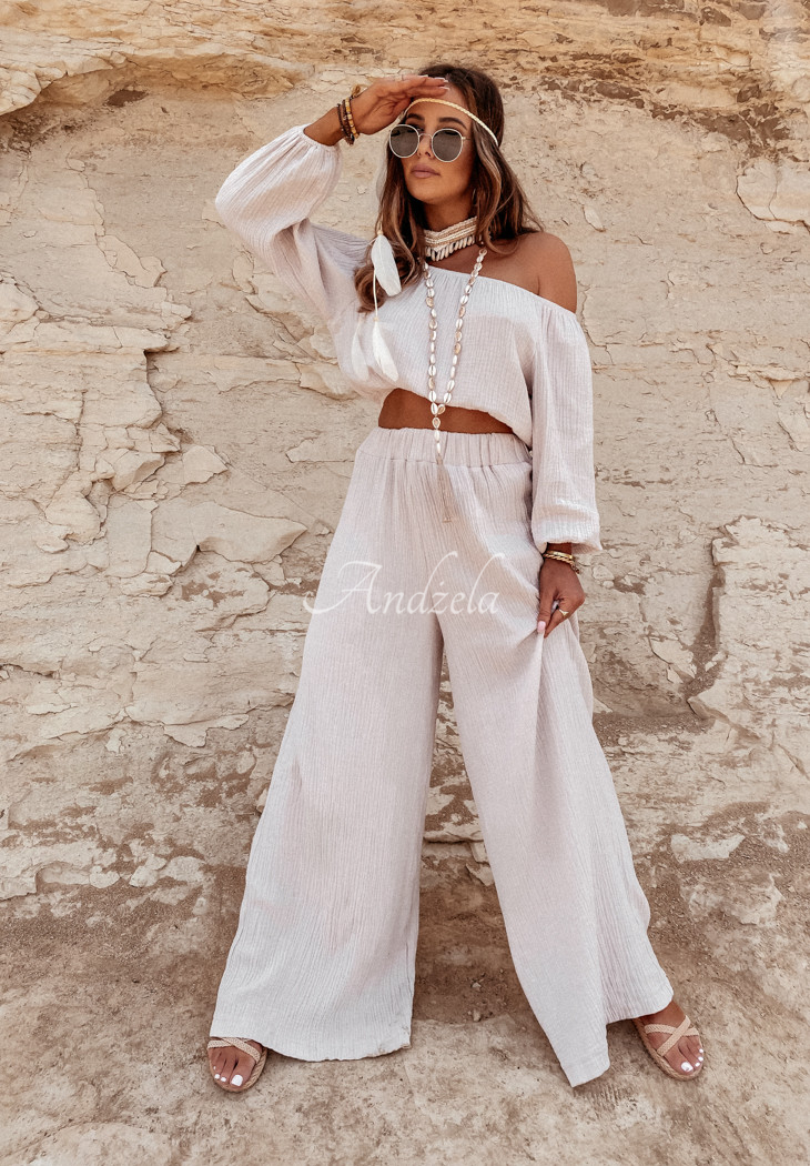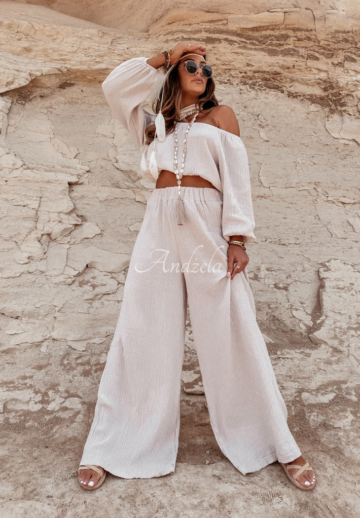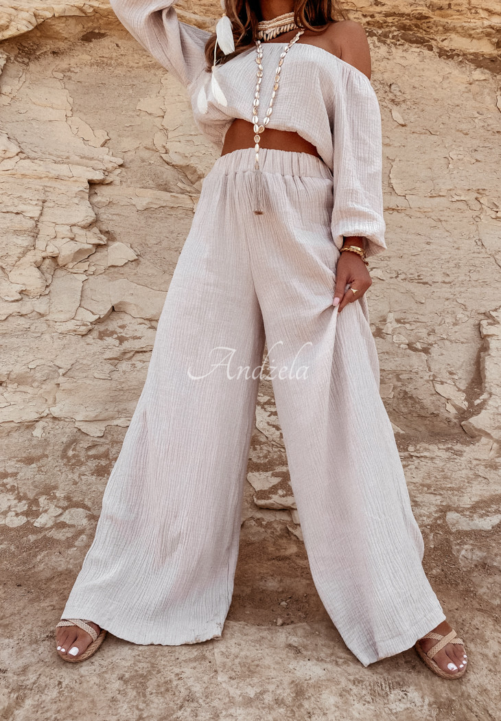 Delicate pants with wide legs and a high waist, made of high-quality muslin fabric. The model has an elastic waistband for a perfect fit. T is an ideal choice for many summer outfits, compose them with a blouse or top from the same collection and ensure a perfect vacation look! High quality product, available in several color variants. Design by ANDŻELA!