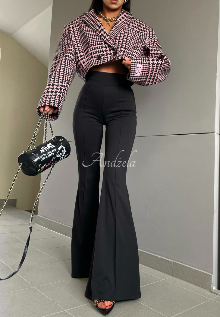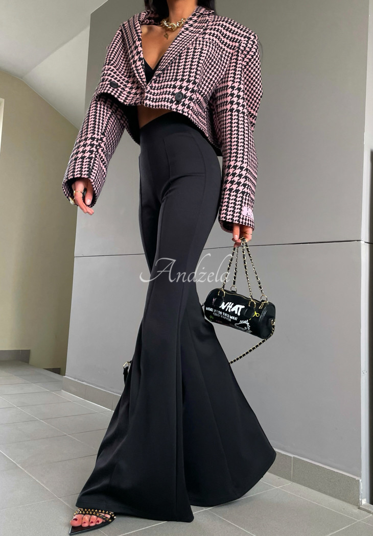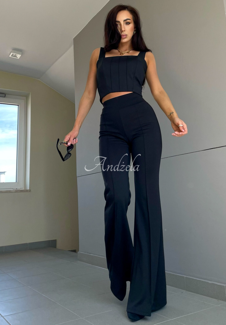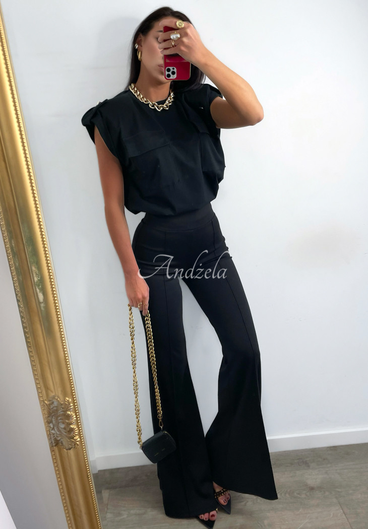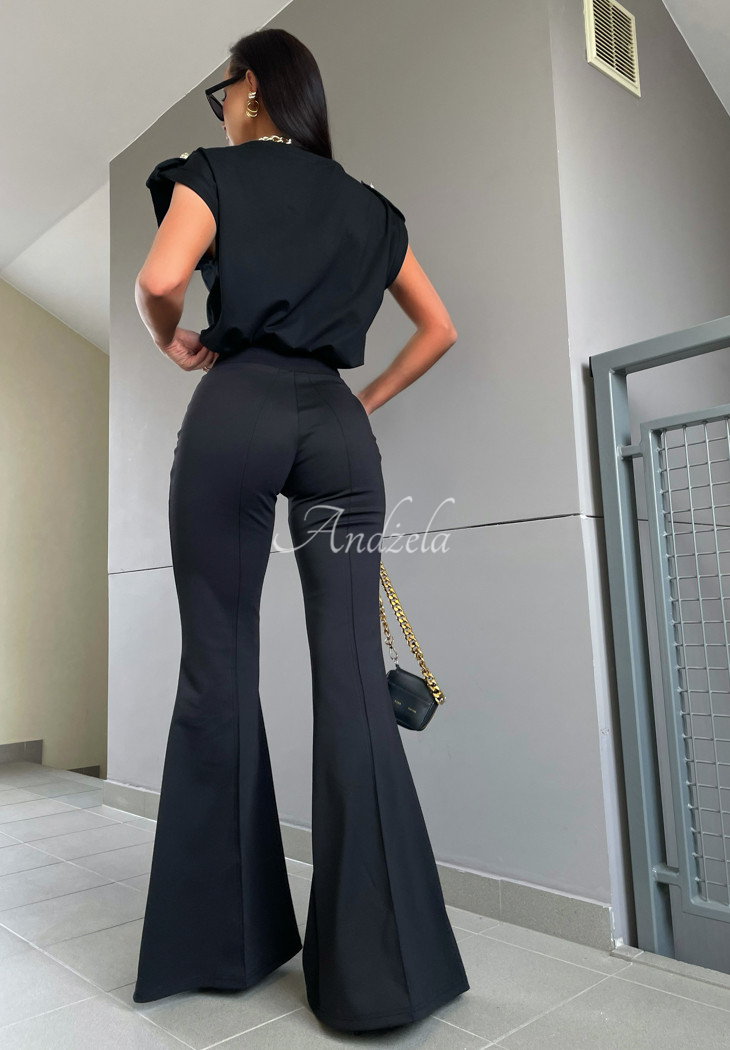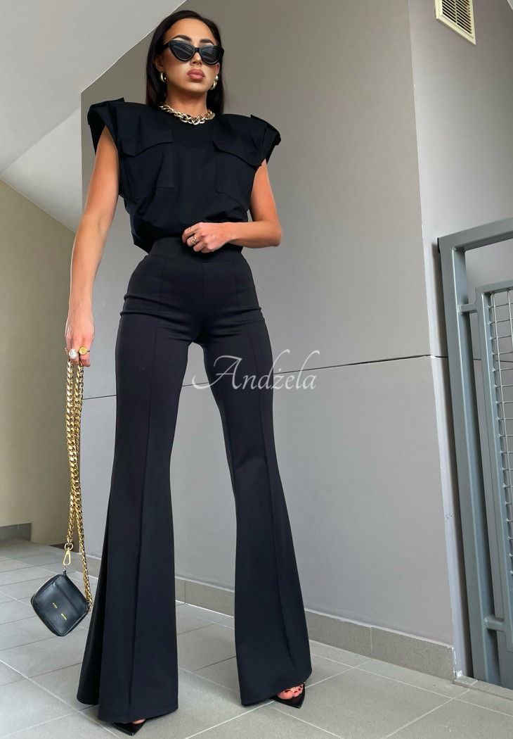 Minimalist bell-bottoms are a proposition that will present themselves extremely fashionable in both everyday and elegant styling. They are distinguished by flared legs with raised seams. This model is made of elastic material, has an elastic waistband, so it fits perfectly to the figure, emphasizing its assets.