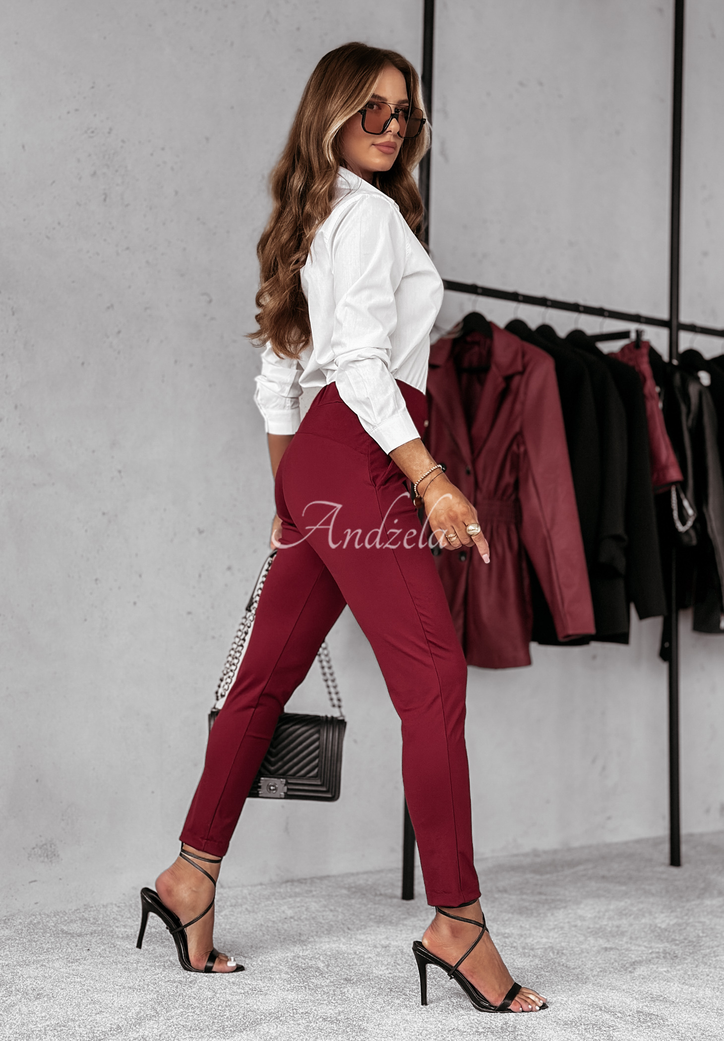 Material pants with tapered legs, distinguished by vertical stitching. The model with pockets on the front, has an elastic waistband for a perfect fit around the waist. This proposition will complement everyday and more elegant looks. The whole is decorated with a gold detail on the front, imitating a belt.