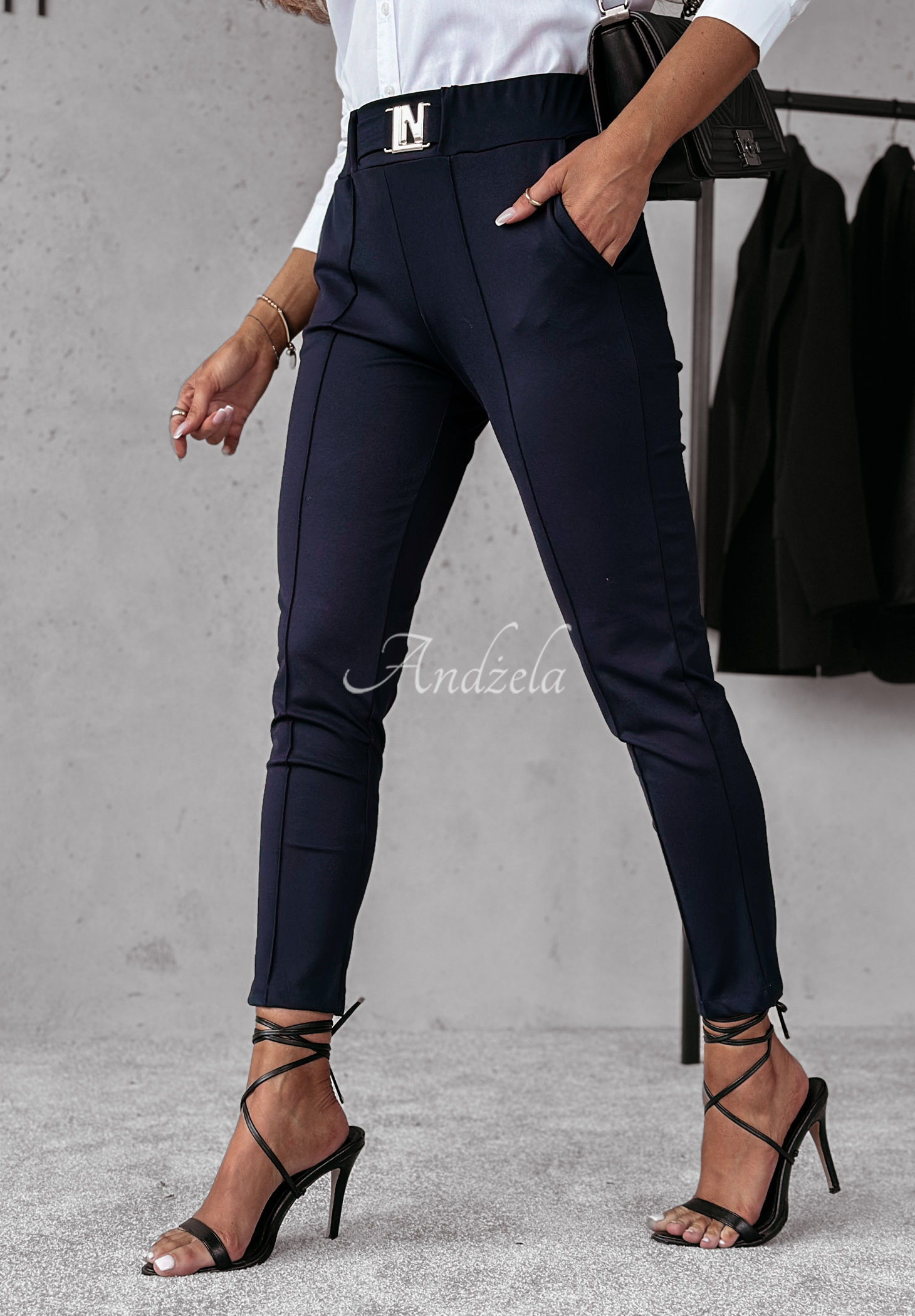 Material pants with tapered legs, distinguished by vertical stitching. The model with pockets on the front, has an elastic waistband for a perfect fit around the waist. This proposition will complement everyday and more elegant looks. The whole is decorated with a gold detail on the front, imitating a belt.