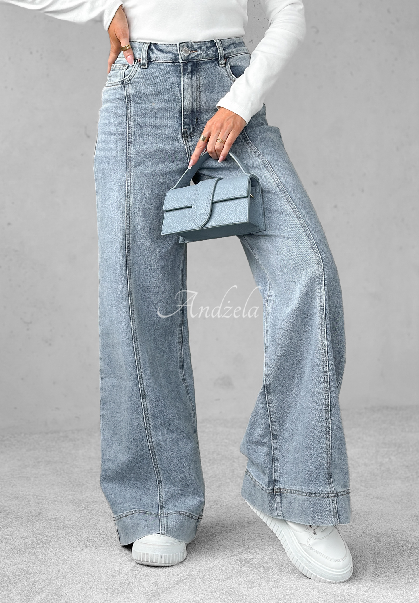 Wide leg jeans are the perfect base for any everyday outfit in a fashionable look. It is a model with straight, wide legs, on which there are stitches. It is fastened with a silver button and zipper, has a high rise, as well as functional front and back pockets and belt loops.