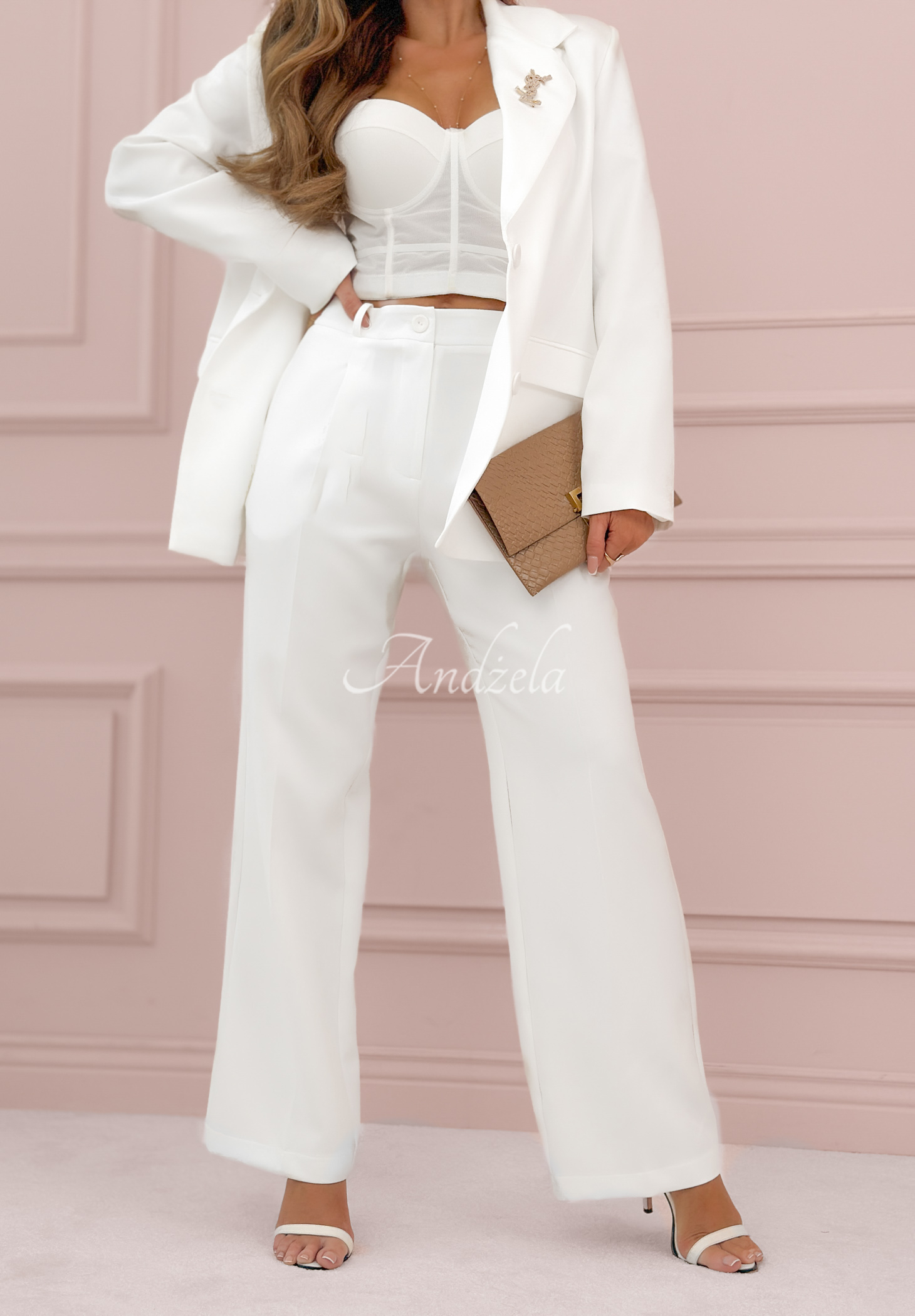 Elegant pants made of non-elastic material with a blend of viscose. It is a wide leg cut model with wide legs and vertical stitching. It is fastened with a zipper and a button, and has belt loops. It will look great with a jacket from the My Necessity line.