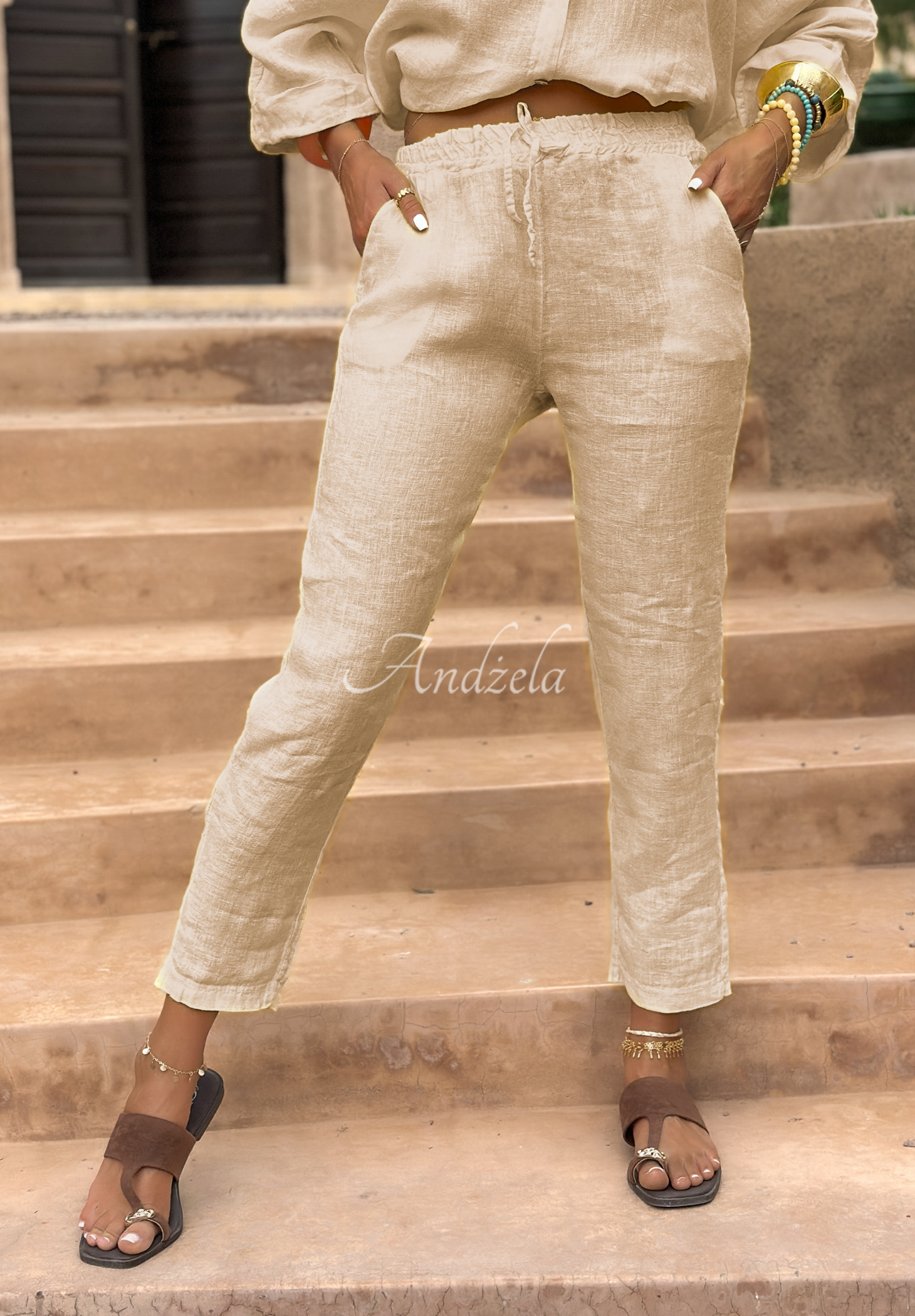 Pants made of high-quality linen fabric. The model with tapered legs, at the waist has an elastic band and a drawstring for adjustment. Its additional advantage is two functional pockets on the front.