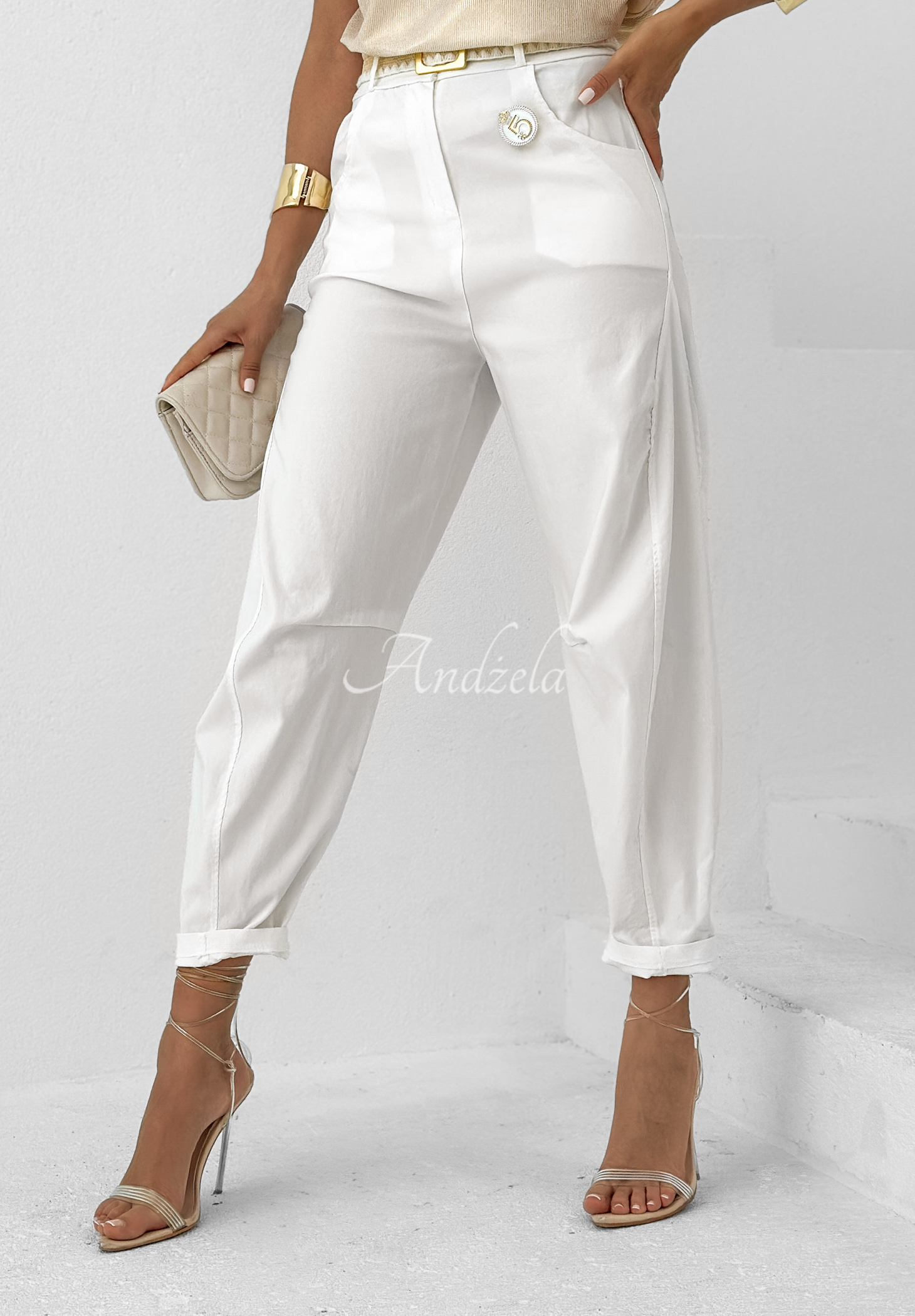 Material pants made of high-quality viscose fabric. This is a high-waisted model with an elastic waistband, button and zipper closure. A proposition with a cut with a tapering leg, both in the front and in the back there are functional pockets. A decorative brooch and a braided belt are included.