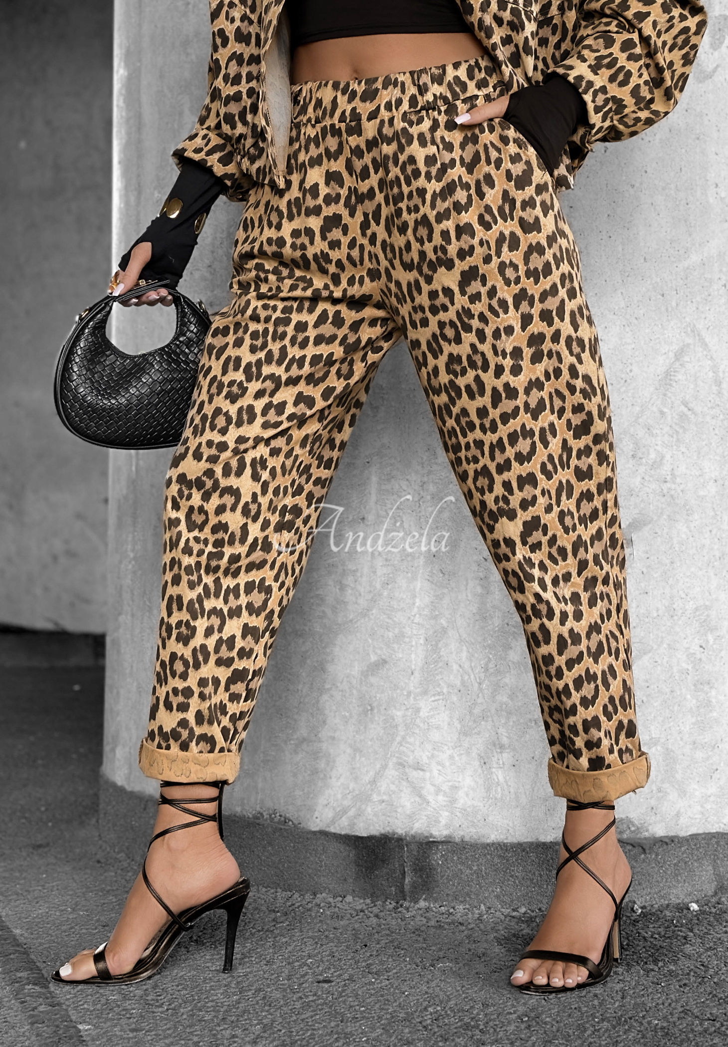 Pants in a fashionable leopard print, made of cotton fabric. It is a model with an elastic waistband and an elevated top. It has a functional pair of pockets located on the front and an imitation one on the back. The whole look will be complemented by a leather belt with a silver buckle included in the set. They will go perfectly with the jacket from the ''Panthera Prowl'' line.