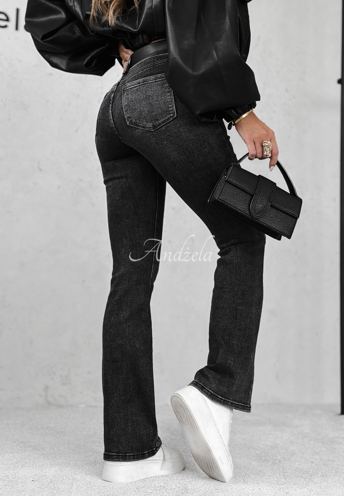 Jeans with a bell cut, made of stretch fabric. It is a mid-rise model, and is fastened with a zipper and a button. Both in the front and in the back there are functional pockets. A belt is included.