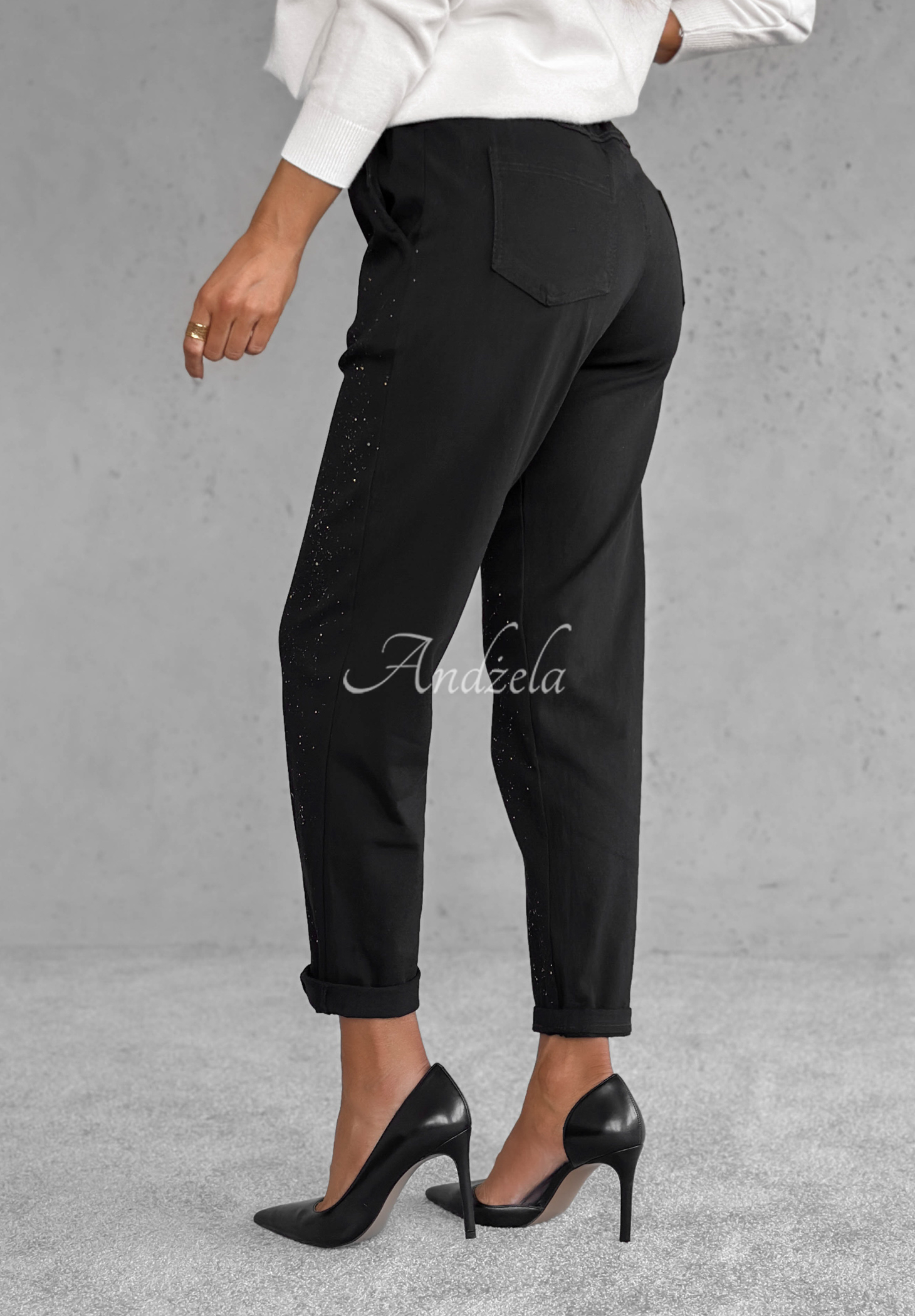 Elastic pants made of cotton fabric with viscose. They are distinguished by decorative brocade on the front of the tapered legs. This is a model with an elastic waistband and pockets on both the front and back. A belt is included in the set.