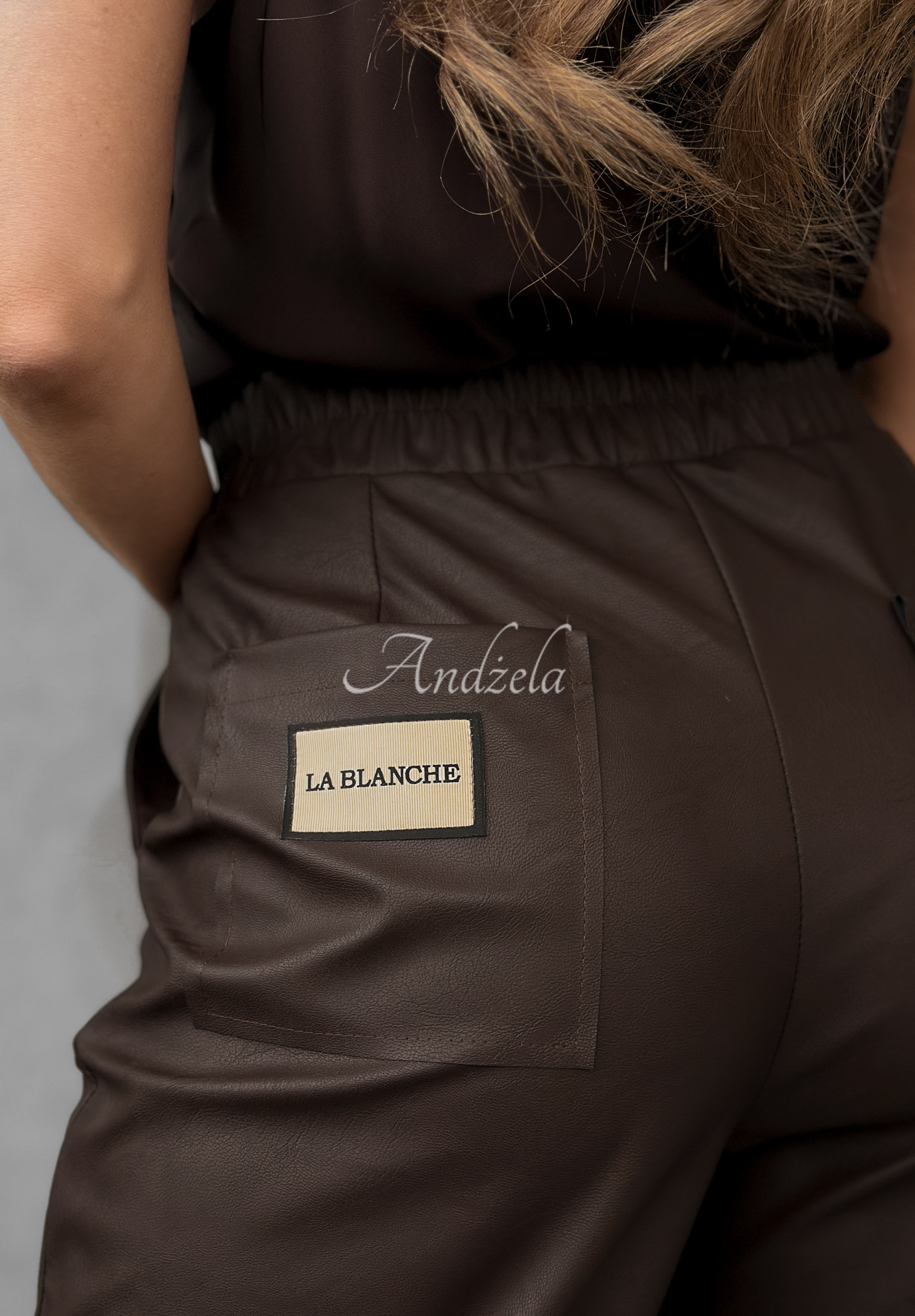 Pants made of waxed fabric. Model with elastic waistband, has pockets on the back and a leg that tapers to the bottom. * stretch fabric* elastic waistband* back pockets* waxed* tapered leg