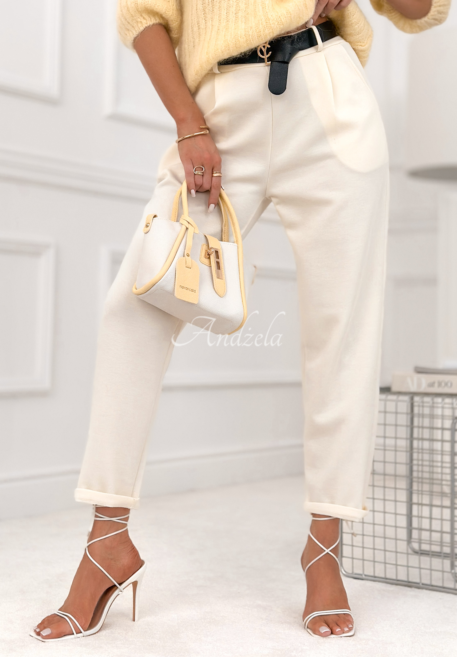 Viscose cigarette pants made of extremely pleasant to the touch, flowing fabric. This is a high-waisted model. There is an elastic band at the back of the waist and functional pockets at the front. The set includes a belt.