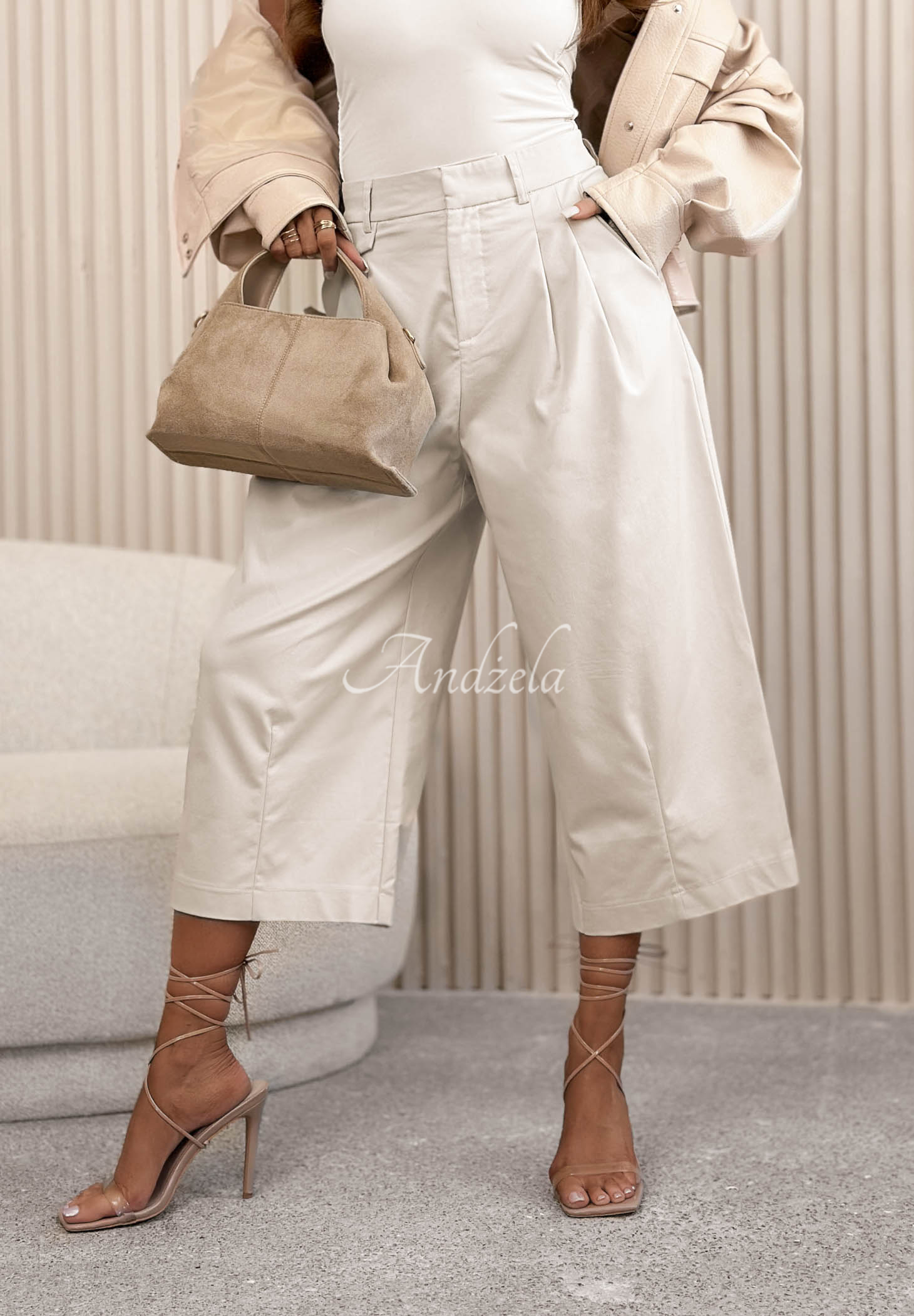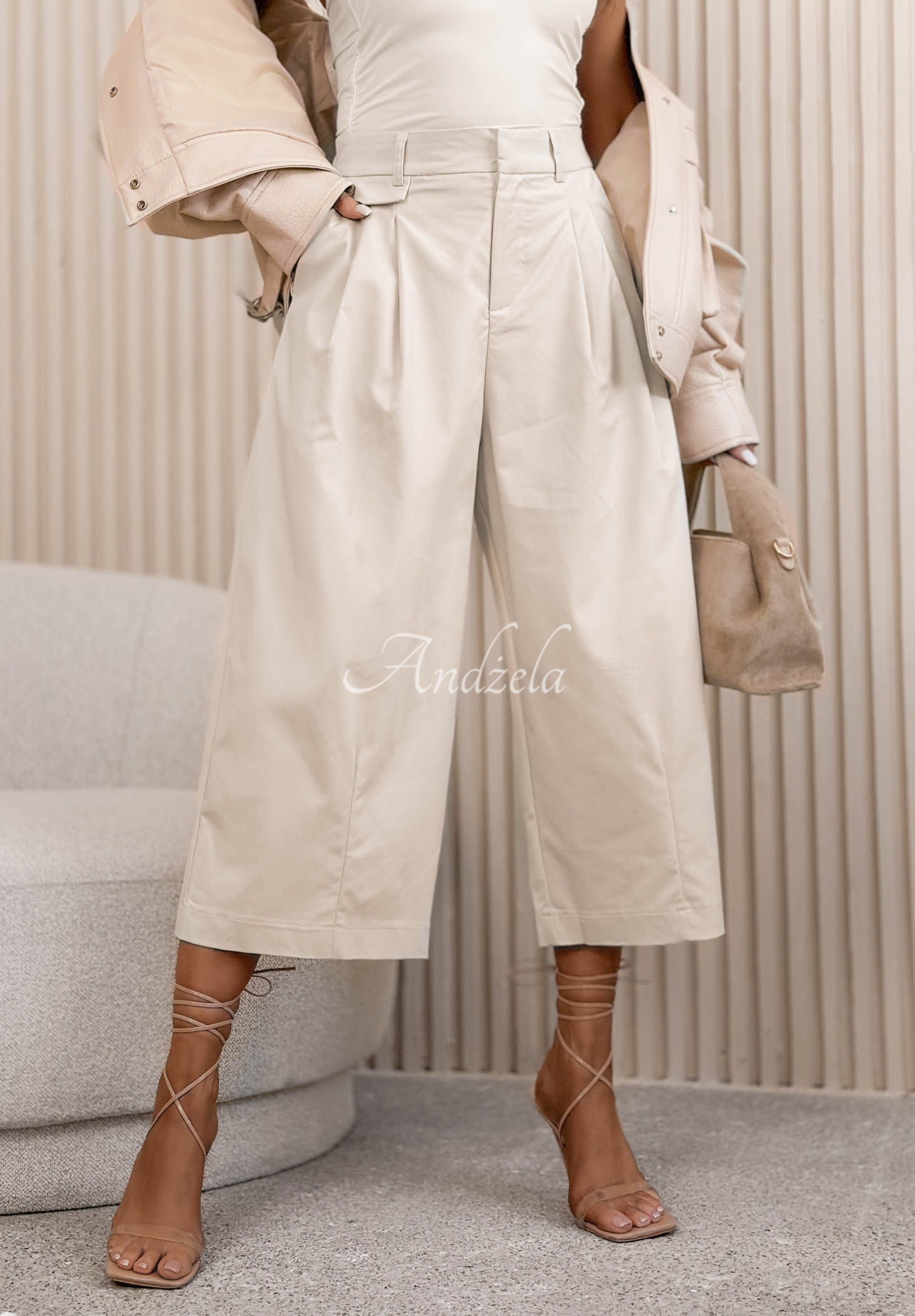 Fabric culottes made of cotton. This style features straight, wide legs and a high waist. There are functional pockets on the front. The garment fastens with a snap and a zipper.