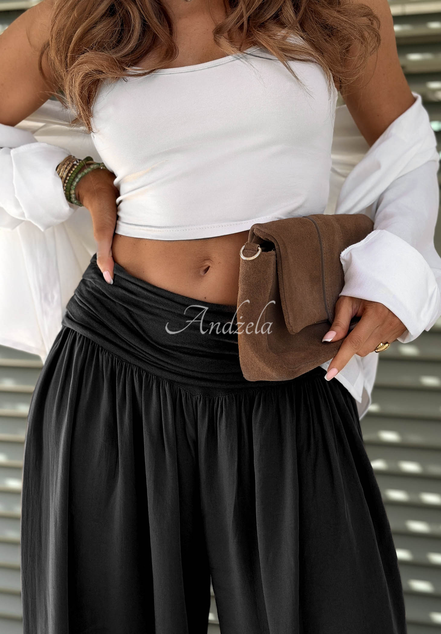 Lightweight, loose-fitting harem-style pants. This style features ribbed cuffs and is made from high-quality viscose fabric. It has an elastic waistband and a wide, gathered waistband.