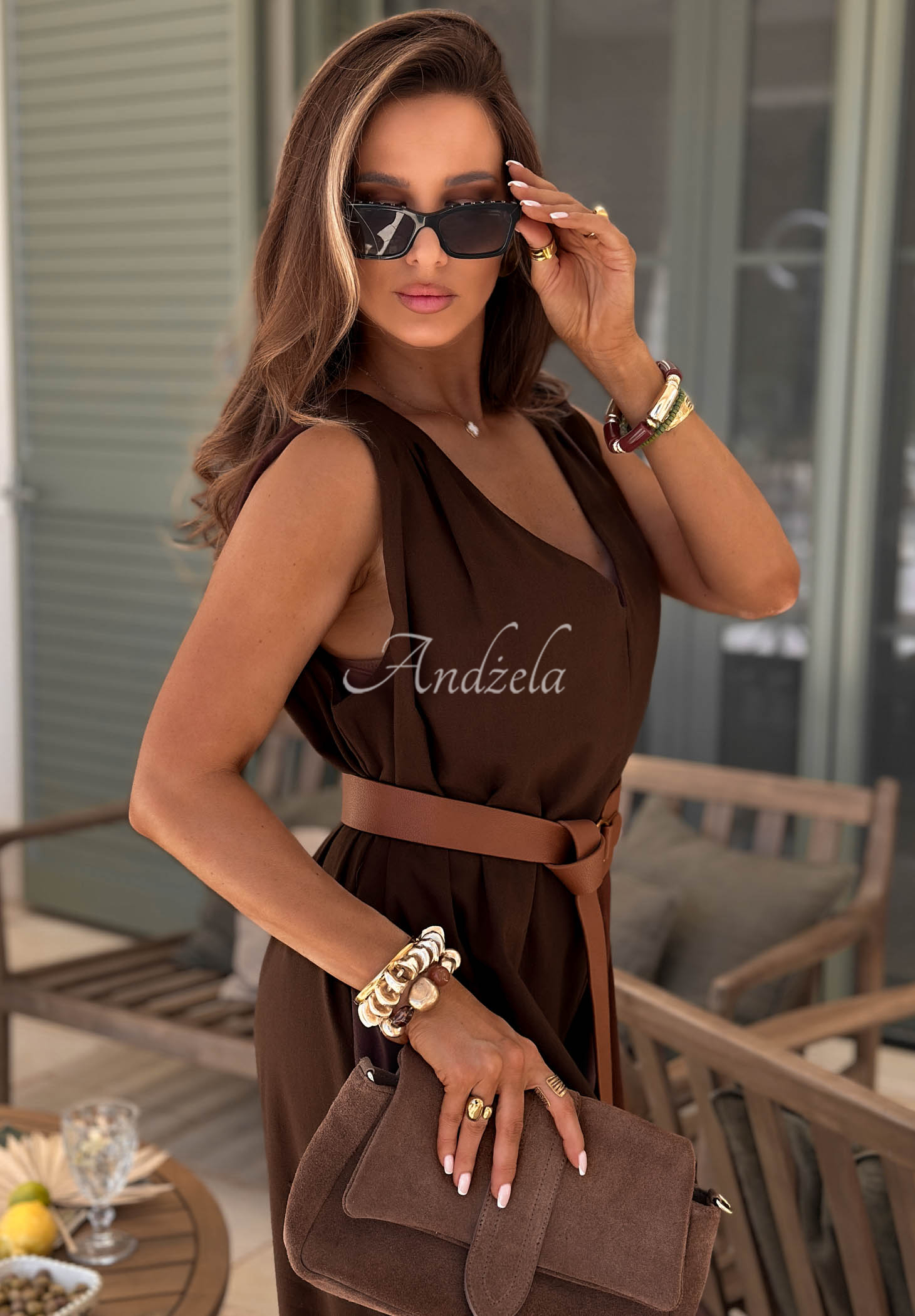 Długi lniany kombinezon z szerokimi nogawkami i paskiem Tanala czekoladowy