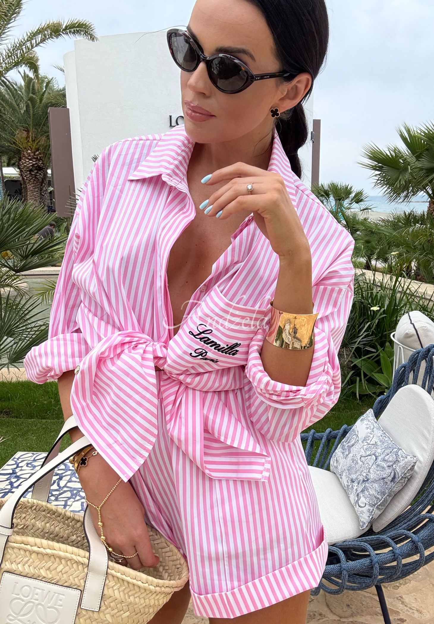 Komplet w paski wykonany z bawełnianego materiału wysokiej jakości. Koszula z kołnierzykiem, posiada długie rękawy zakończone mankietami. To model z zapięciem na rząd guzików oraz funkcjonalną kieszonką na biuście. Spodenki to fason z wysokim stanem i elastyczną gumką w pasie. Posiadają kieszenie oraz podwinięte nogawki.