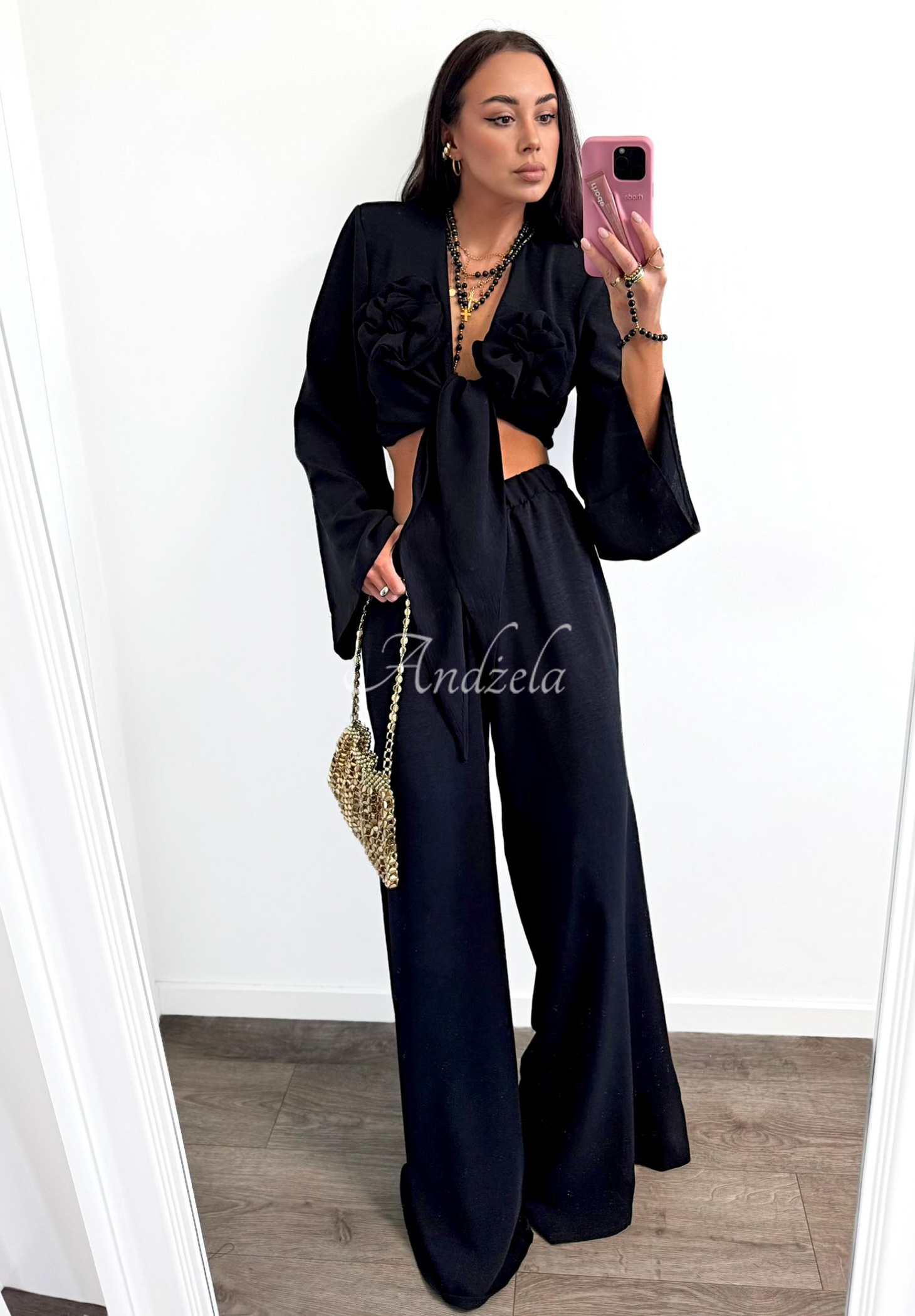 Wiskozowy komplet wykonany z przyjemnego, lekkiego materiału to doskonała propozycja na letnie dni! Wiązana koszula wyróżnia się ozdobnymi kwiatami na wysokości biustu. Posiada poduszki na ramionach oraz szerokie rękawy. Spodnie to model o kroju wide leg z elastyczną gumką w pasie oraz z funkcjonalnymi kieszeniami z przodu.