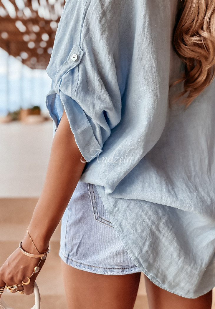 Lekka koszula wykonana z wysokiej jakości, lnianego materiału. Zapinana jest na guziki, posiada kołnierzyk, a także regulację długości rękawów. Oversizowy krój doskonale wpasuje się w luźniejsze stylizacje.