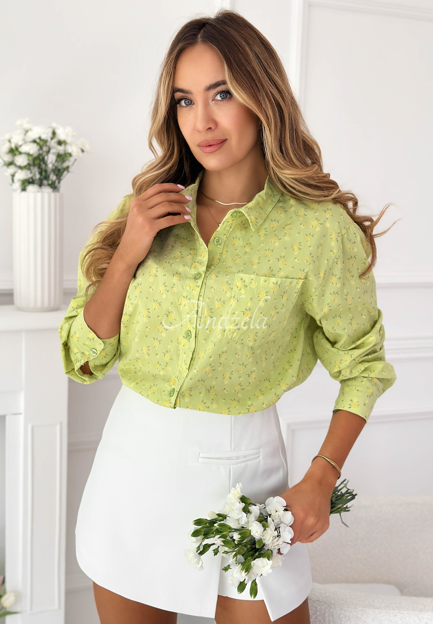 Bawełniana koszula w kwiaty Marbella pistacjowa