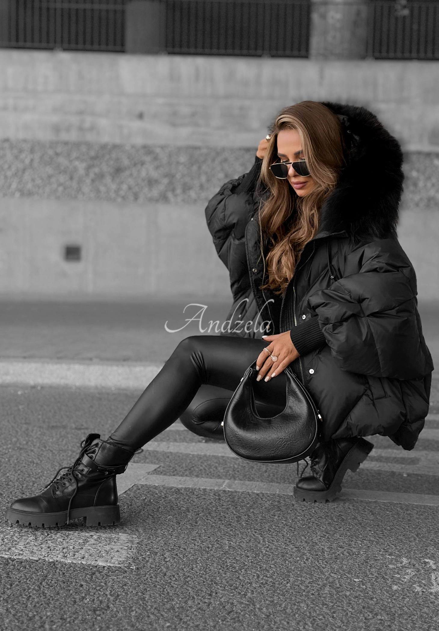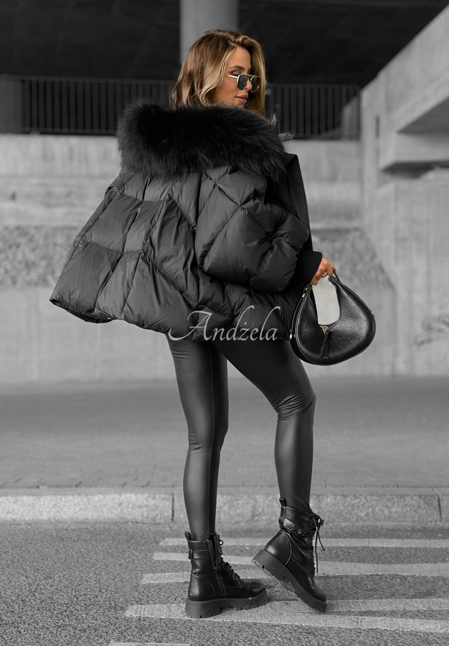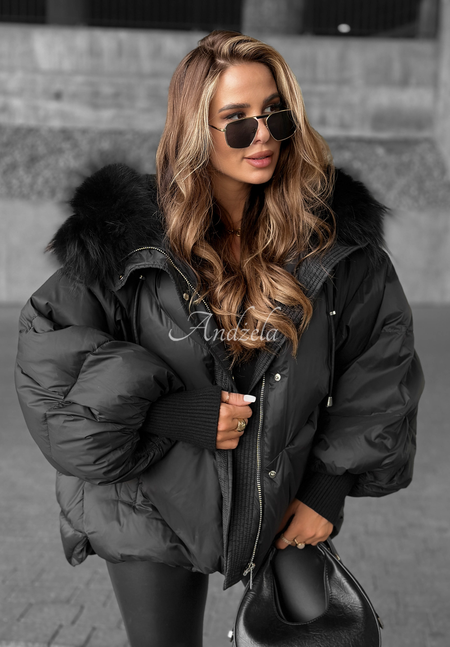 Puchowa kurtka z kapturem wykonana z wysokiej jakości tkanin. To model z odpinanym naturalnym futerkiem, ocieplany puchem kaczym. Wyróżnia się oversizowym krojem oraz szerokimi rękawami z dzianinowymi wstawkami. Z przodu posiada funkcjonalne kieszenie oraz zapięcie na suwak i napy. Przy kapturze, na zakończeniu rękawów oraz w dolnej części znajdują się ściągacze.
